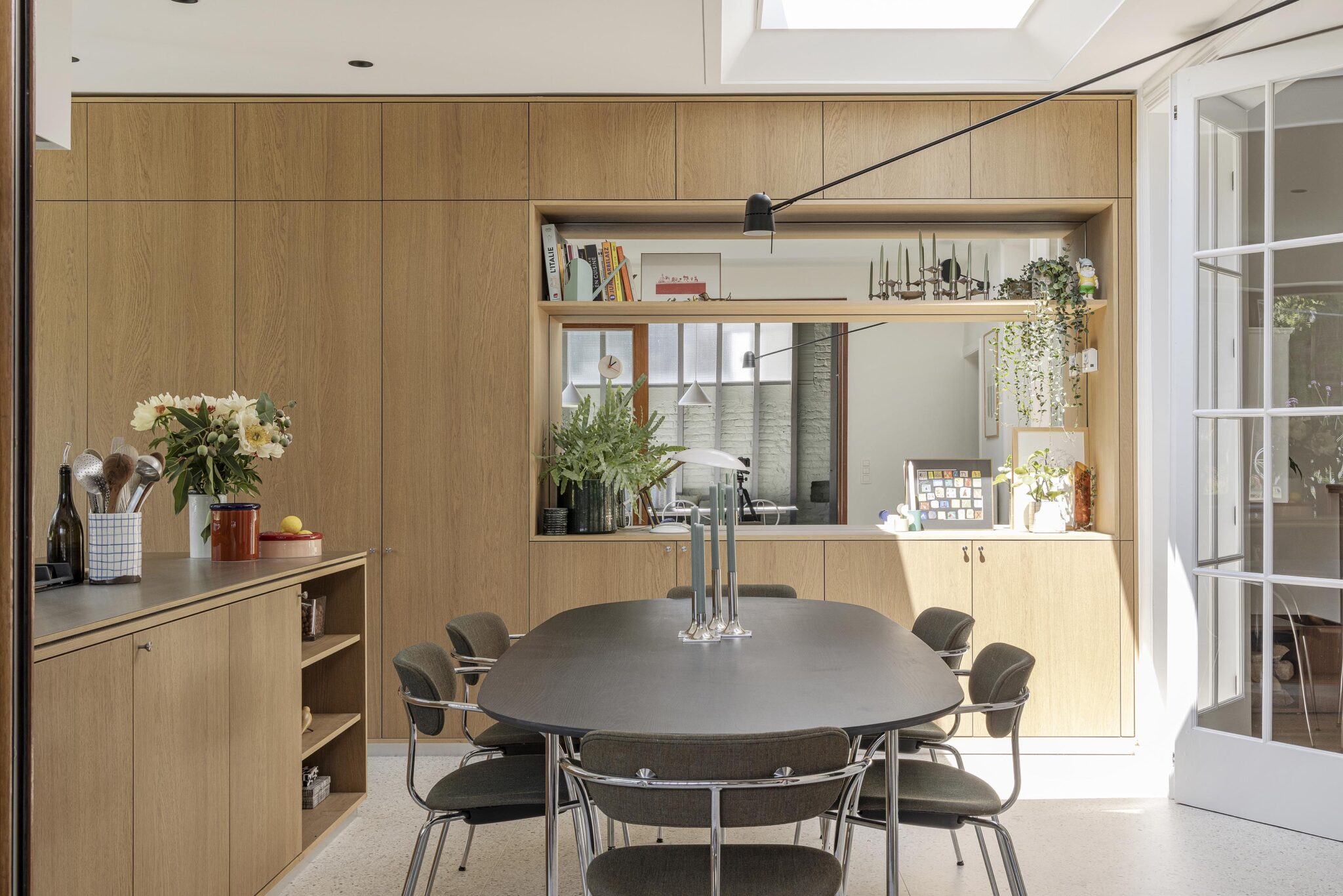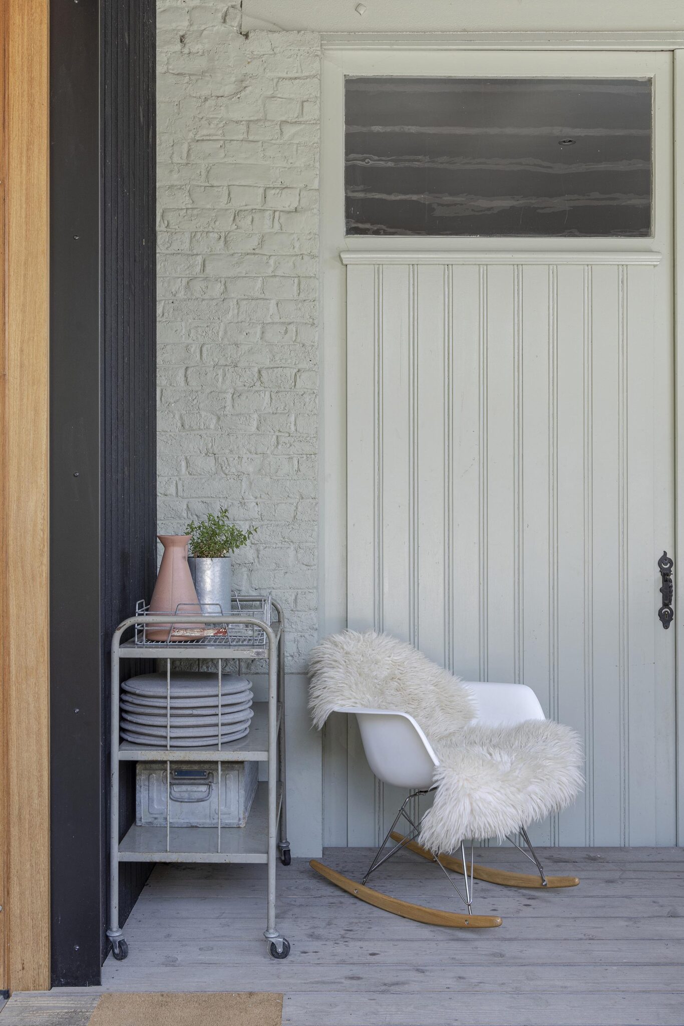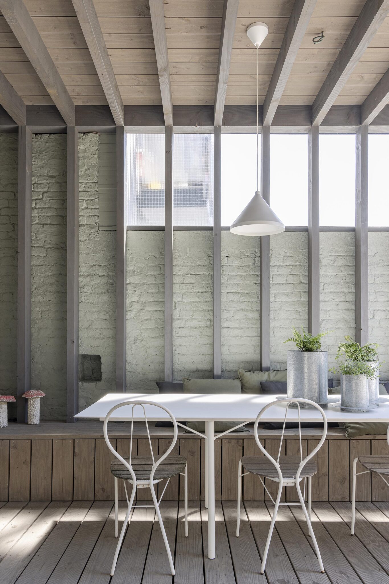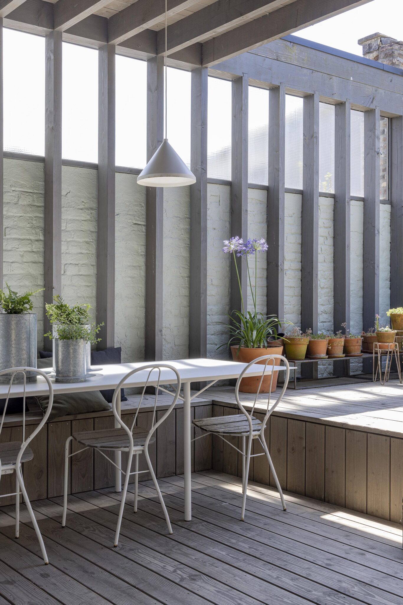 Une terrasse couverte a été créée à l’emplacement d’une ancienne buanderie, accessible grâce à une nouvelle ouverture sur l’extérieur.