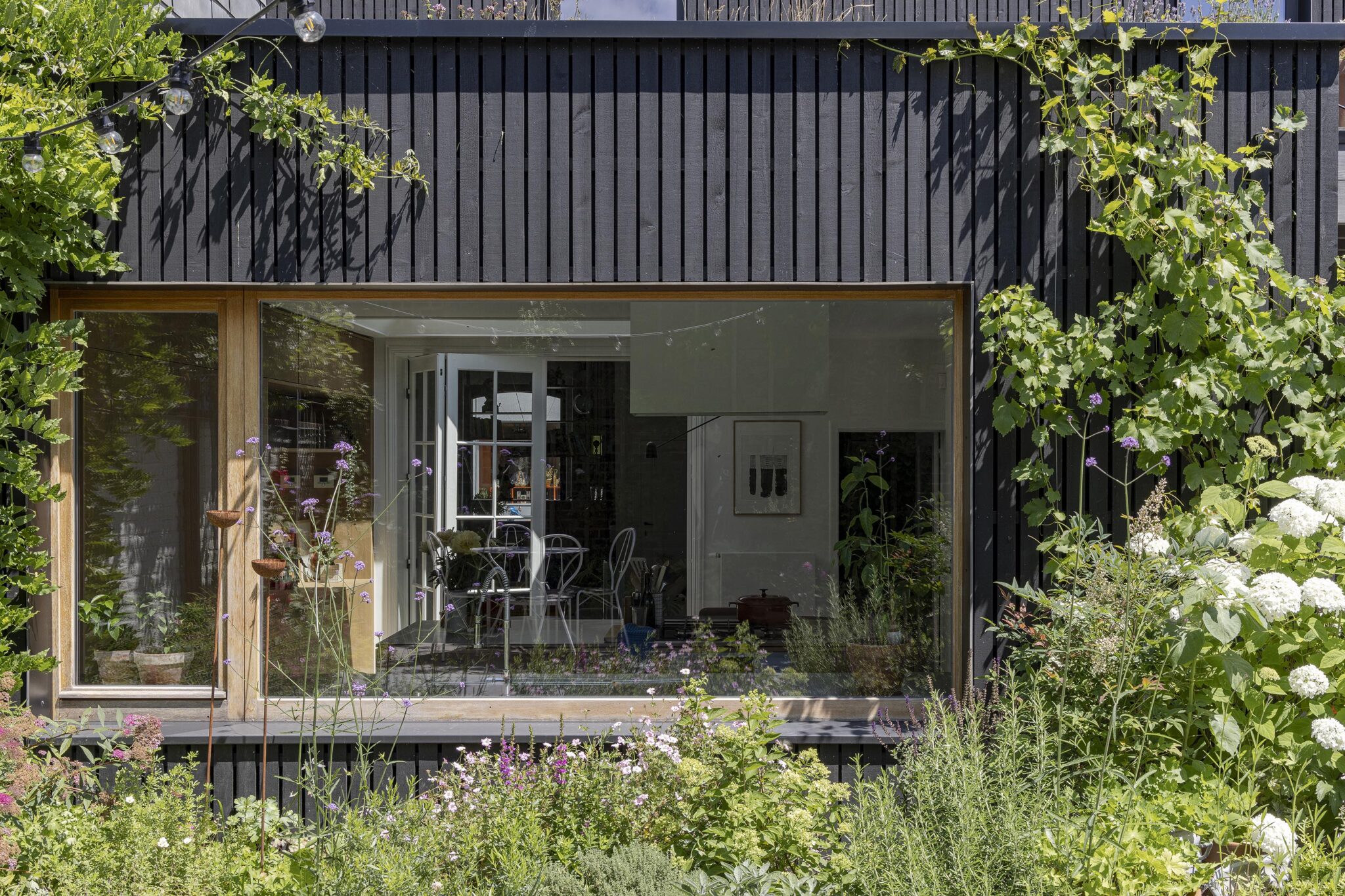 La façade arrière a été recouverte d’un bardage peint en noir permettant de lui donner son caractère propre et de faire d’autant plus ressortir la végétation.