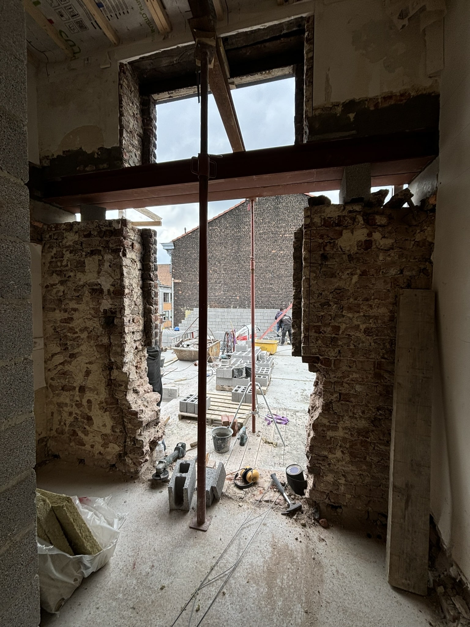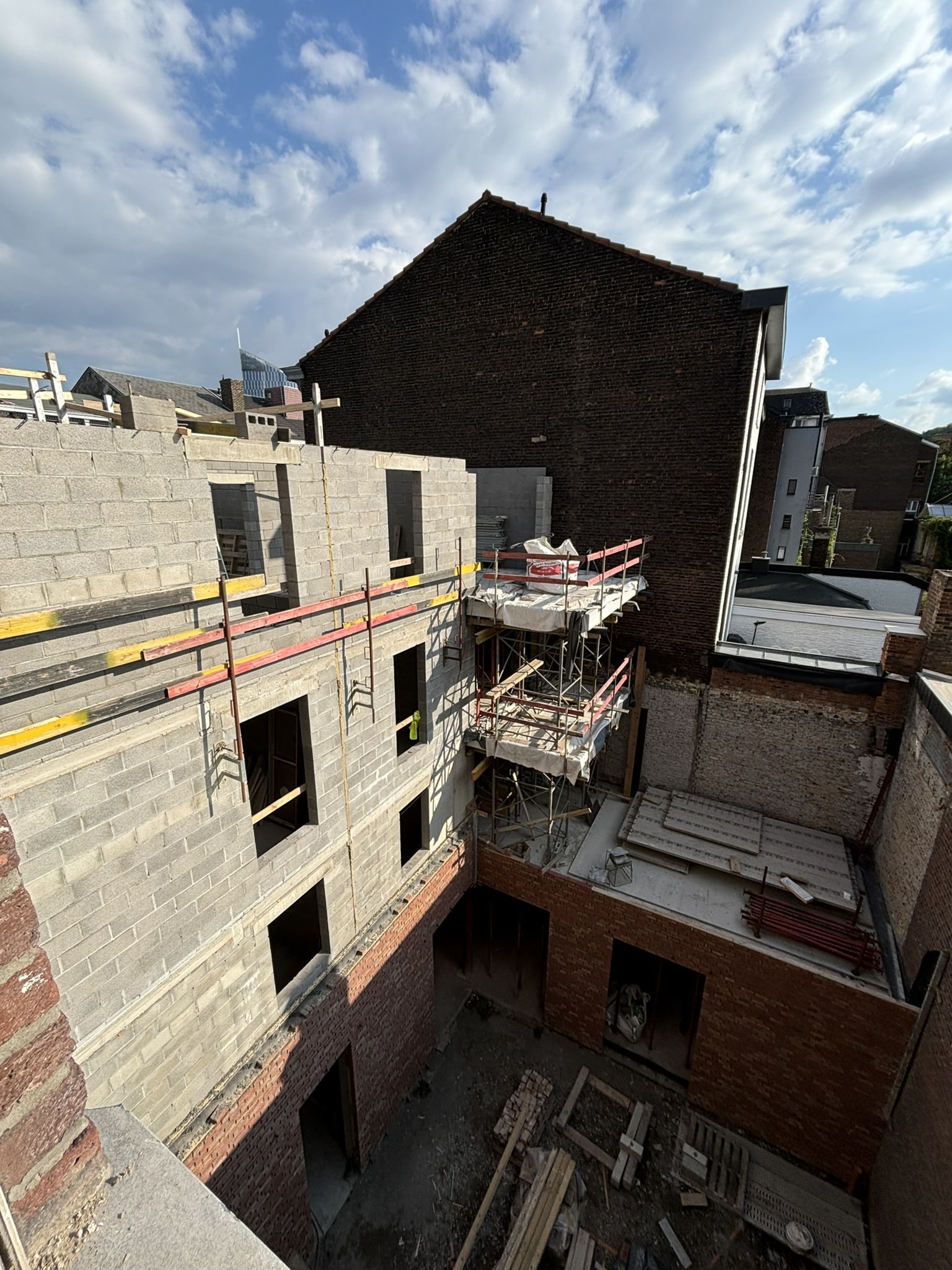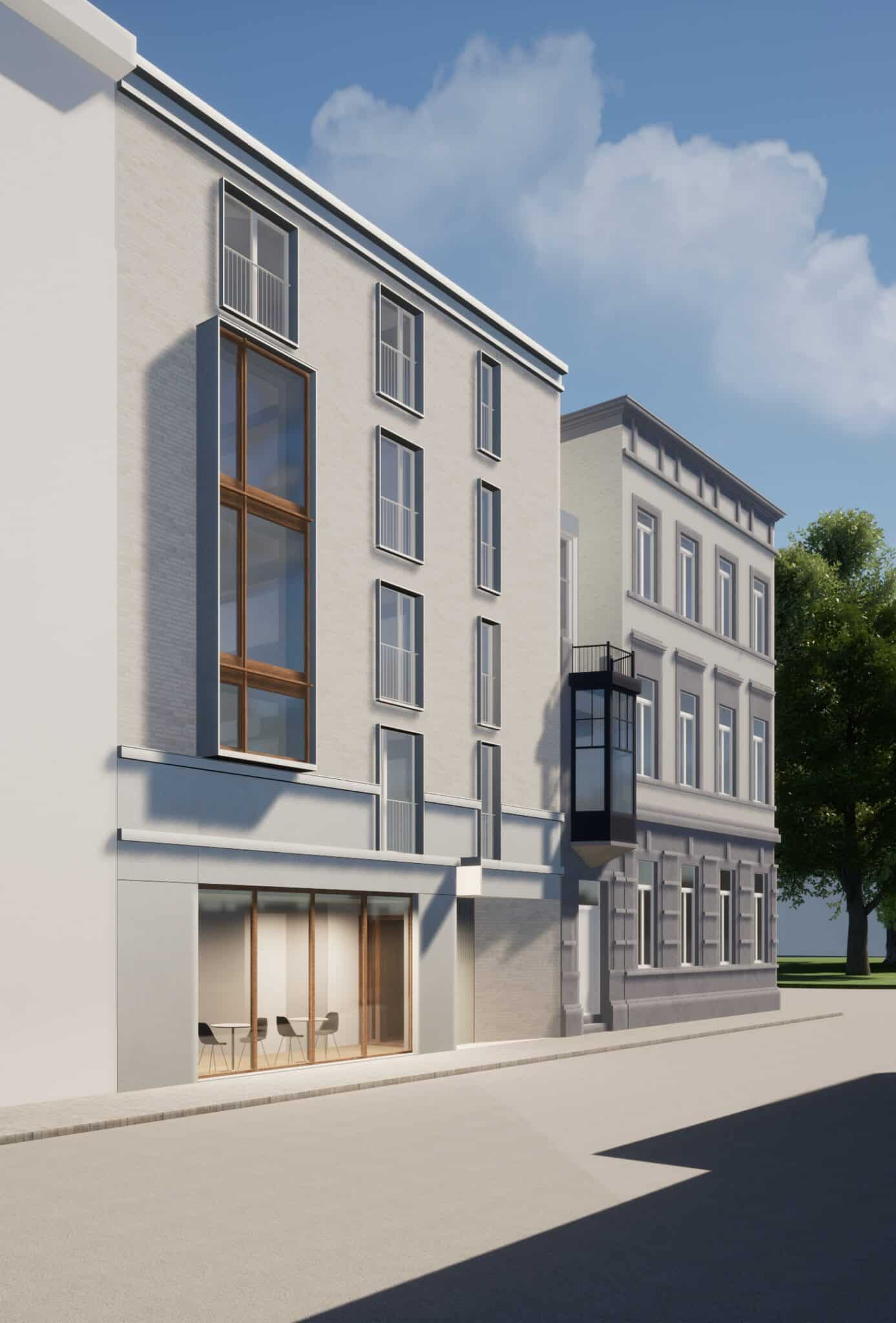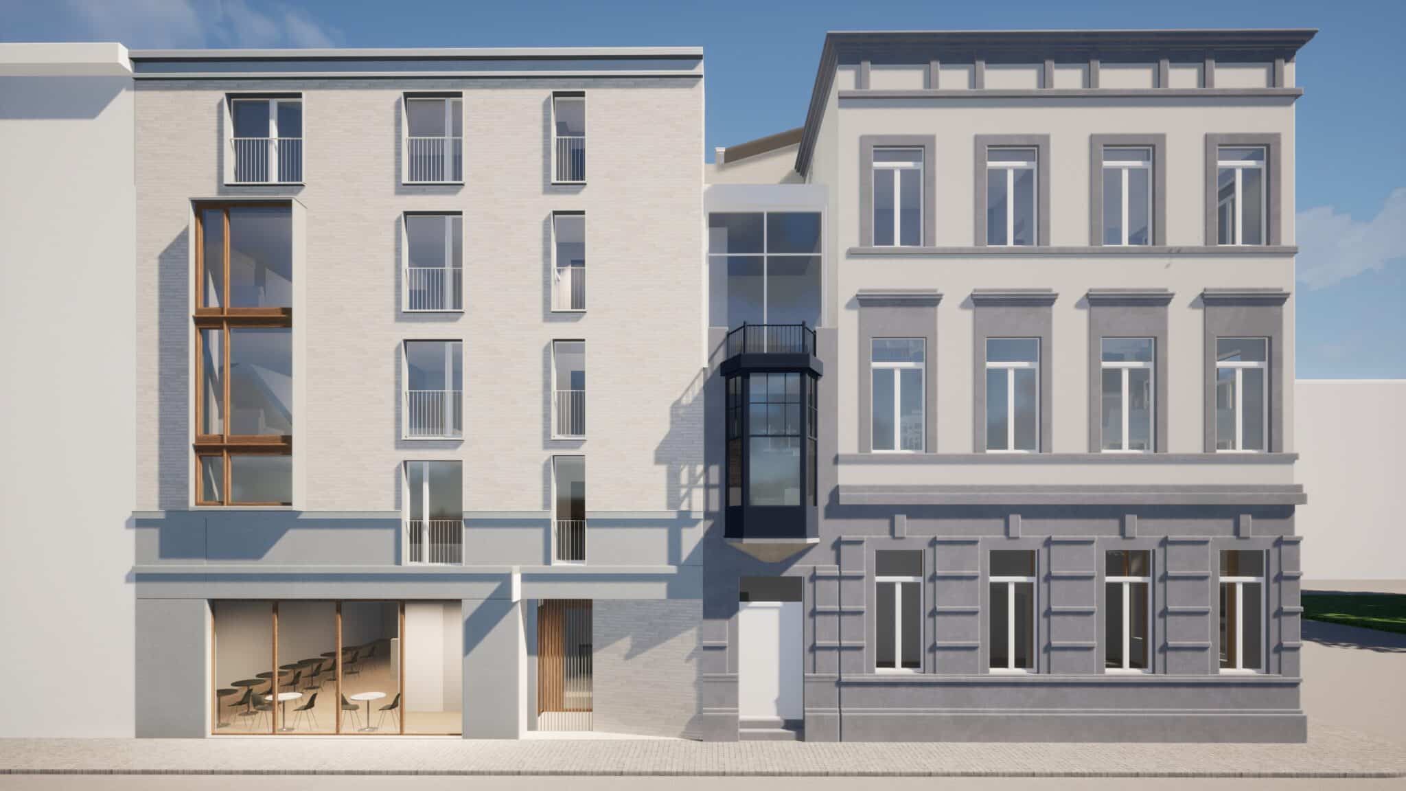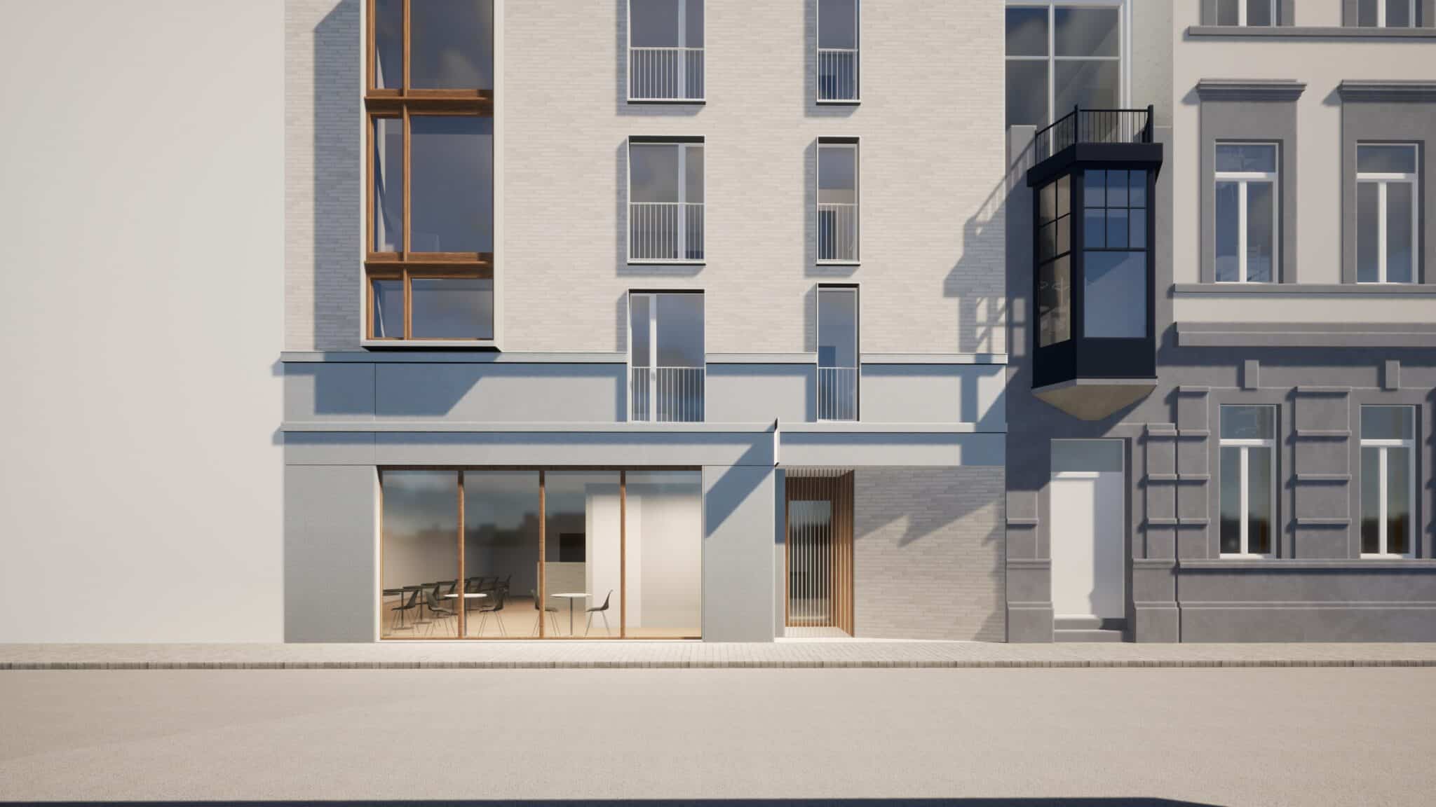 La seconde partie du projet porte sur la démolition et la reconstruction des deux bâtiments situés rue Dartois, vétustes et dépourvus de qualité particulière. Le défi a ensuite été de créer un lien spatial entre l’ancien et le nouveau, puisque trois appartements en duplex, situés aux 2ᵉ et 3ᵉ étages de la Place de Bronckart, partagent désormais une entrée et une circulation commune avec les quatre appartements de la rue Dartois. Un espace commercial au rez-de-chaussée permettra d’accueillir des professions libérales.