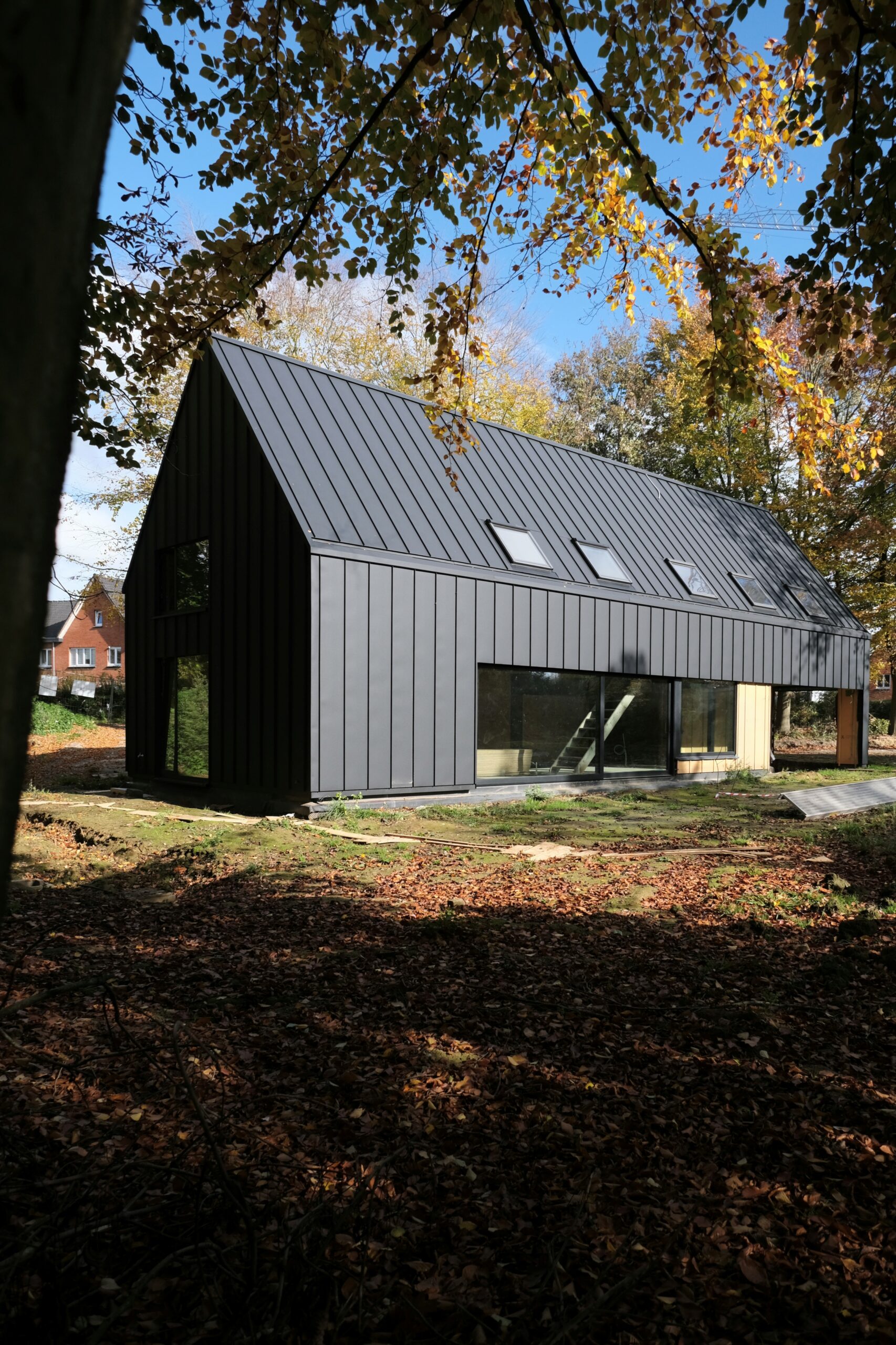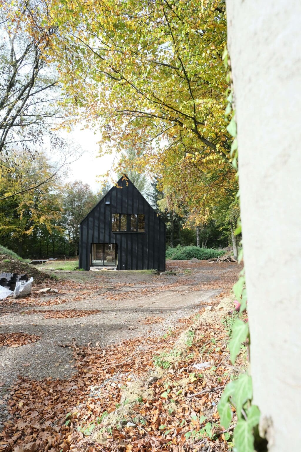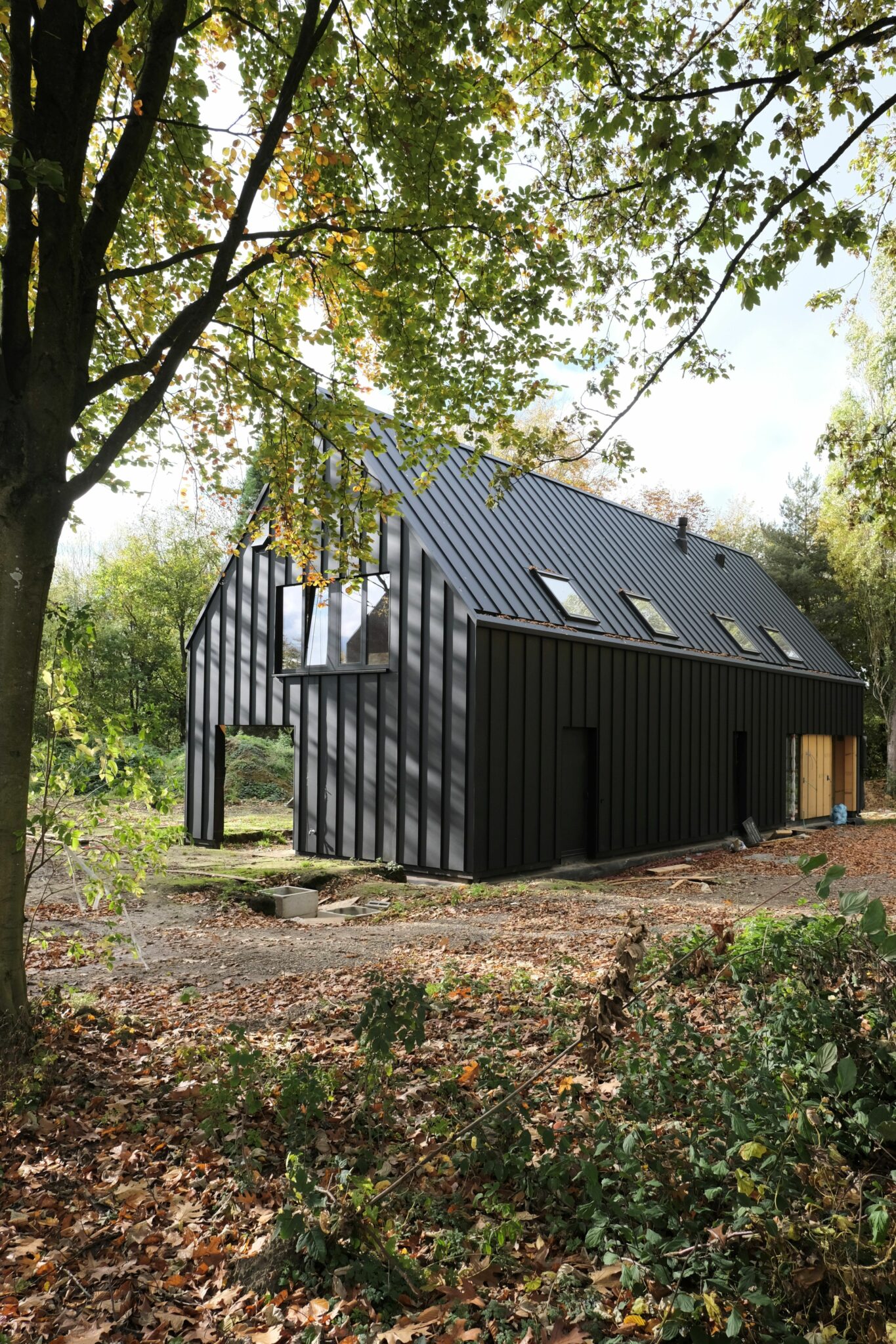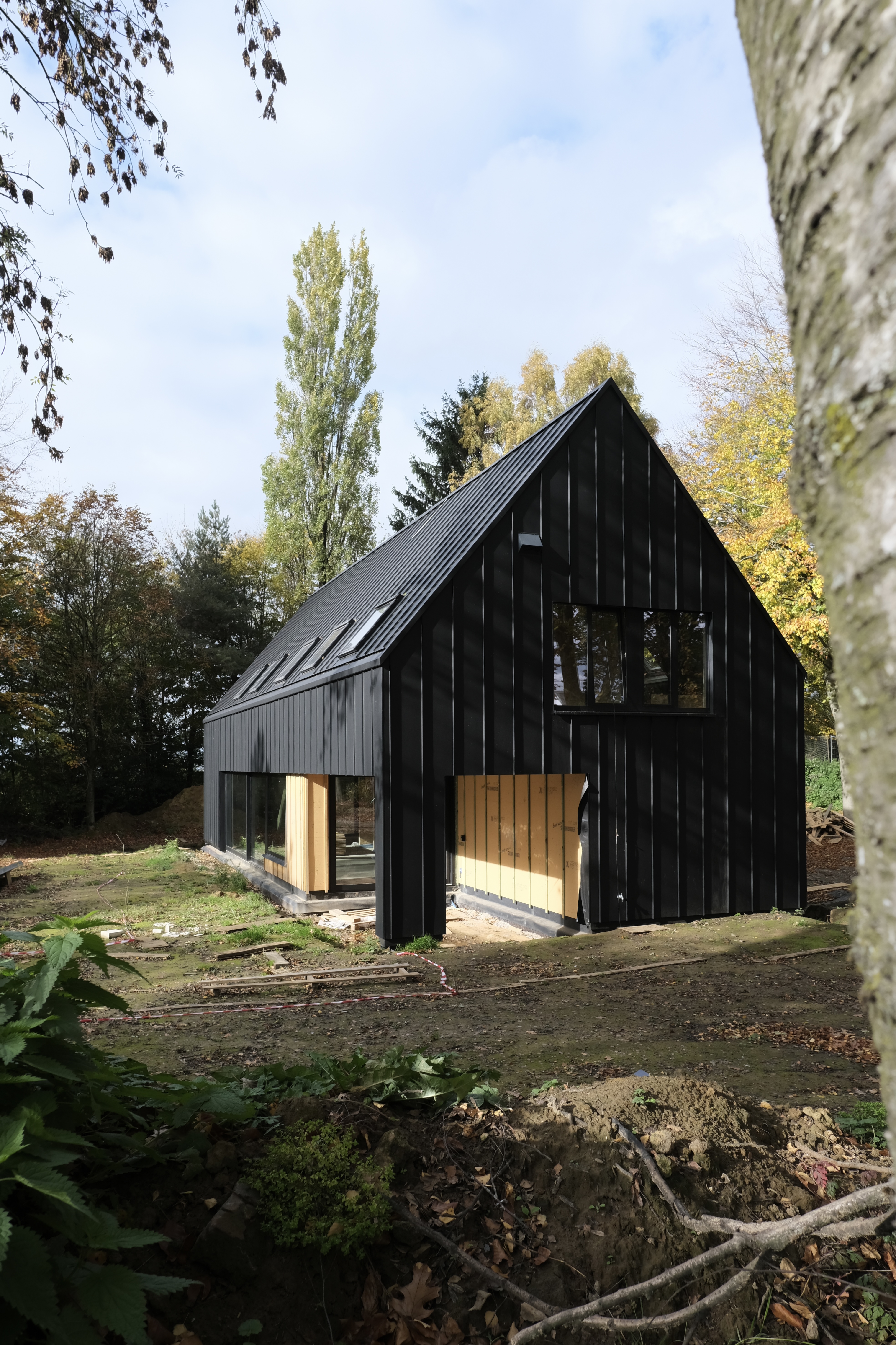La maison est construite en ossature bois et recouverte d’un bardage métallique noir ainsi que de touches de bois à l’extérieur.