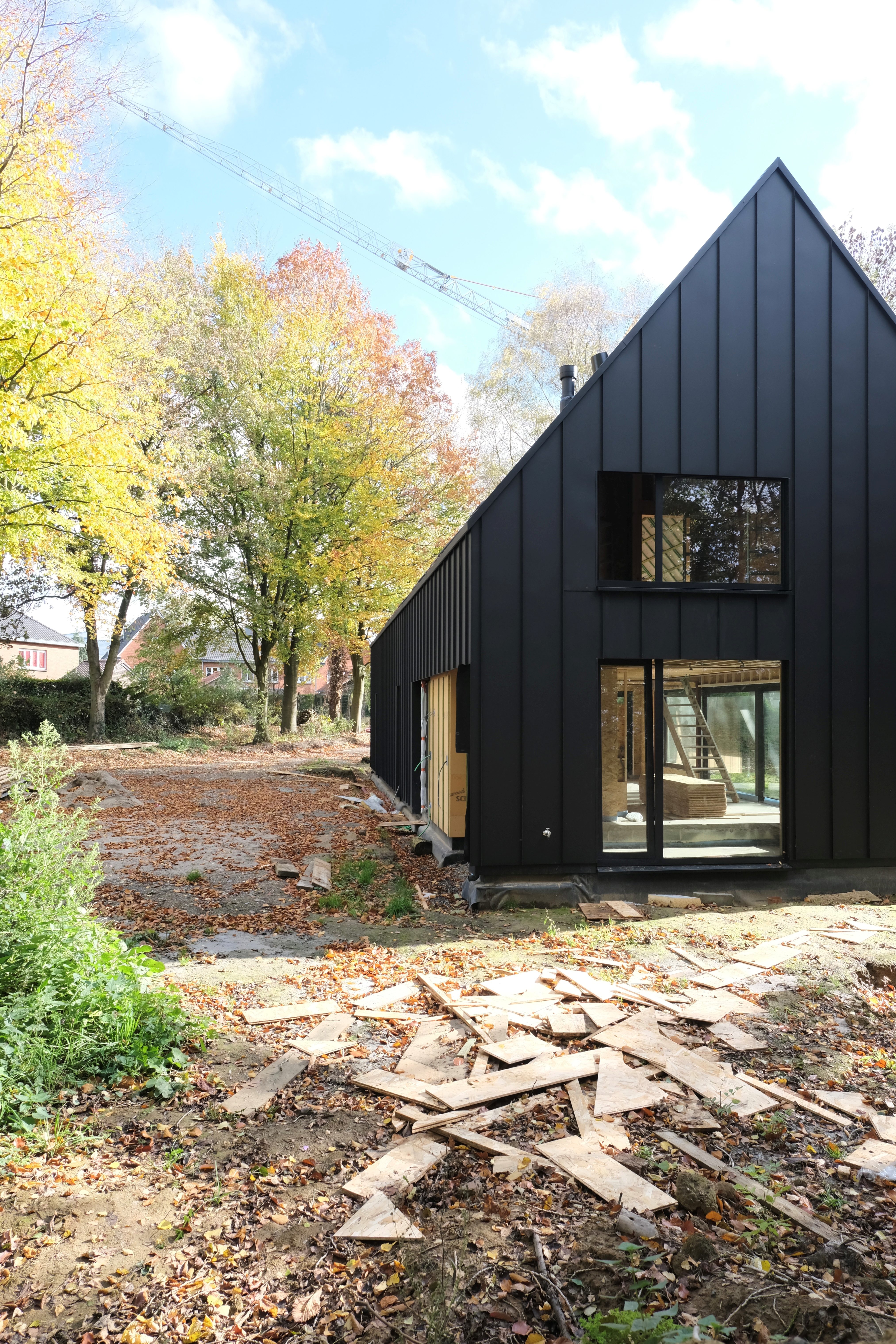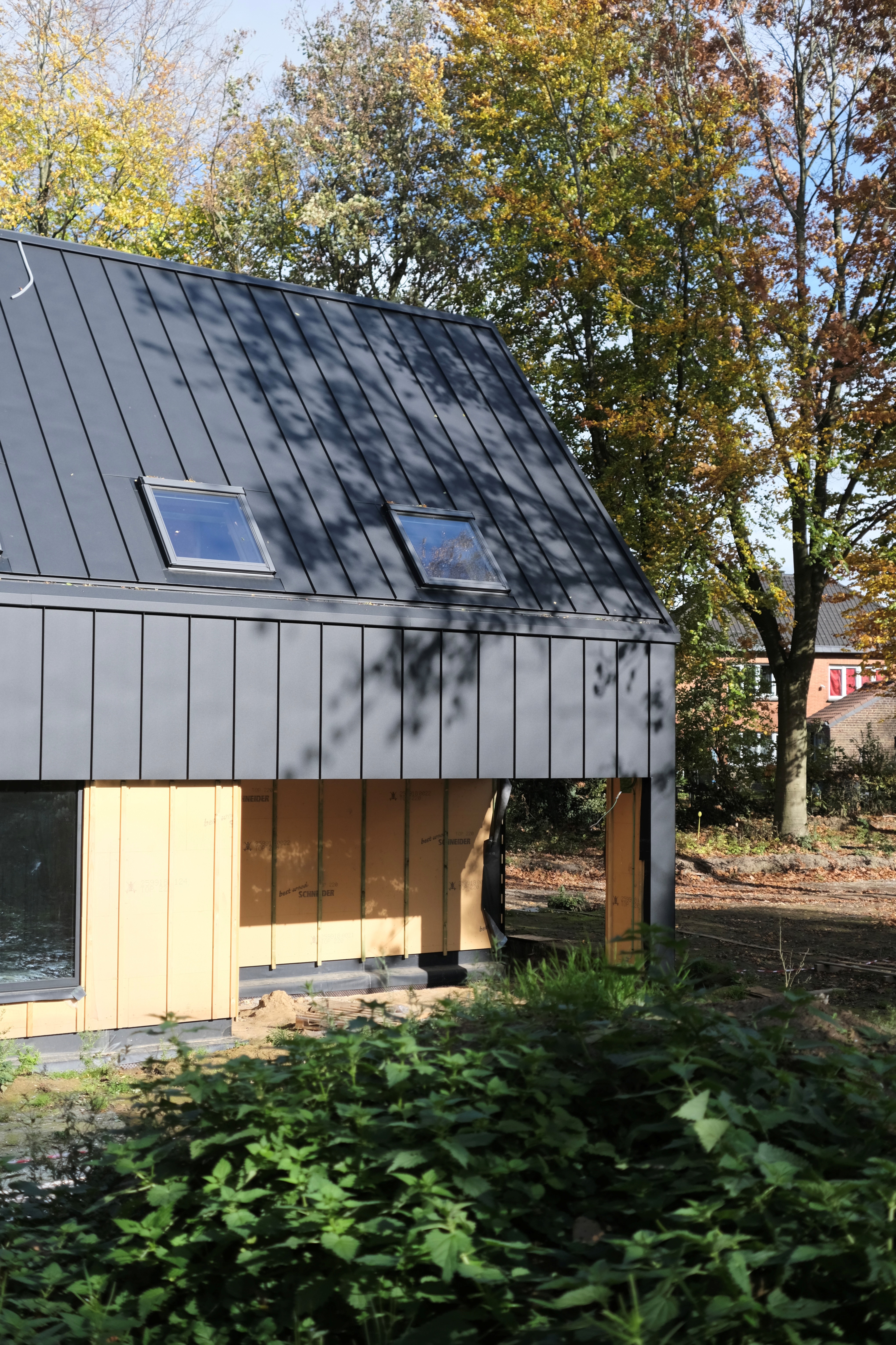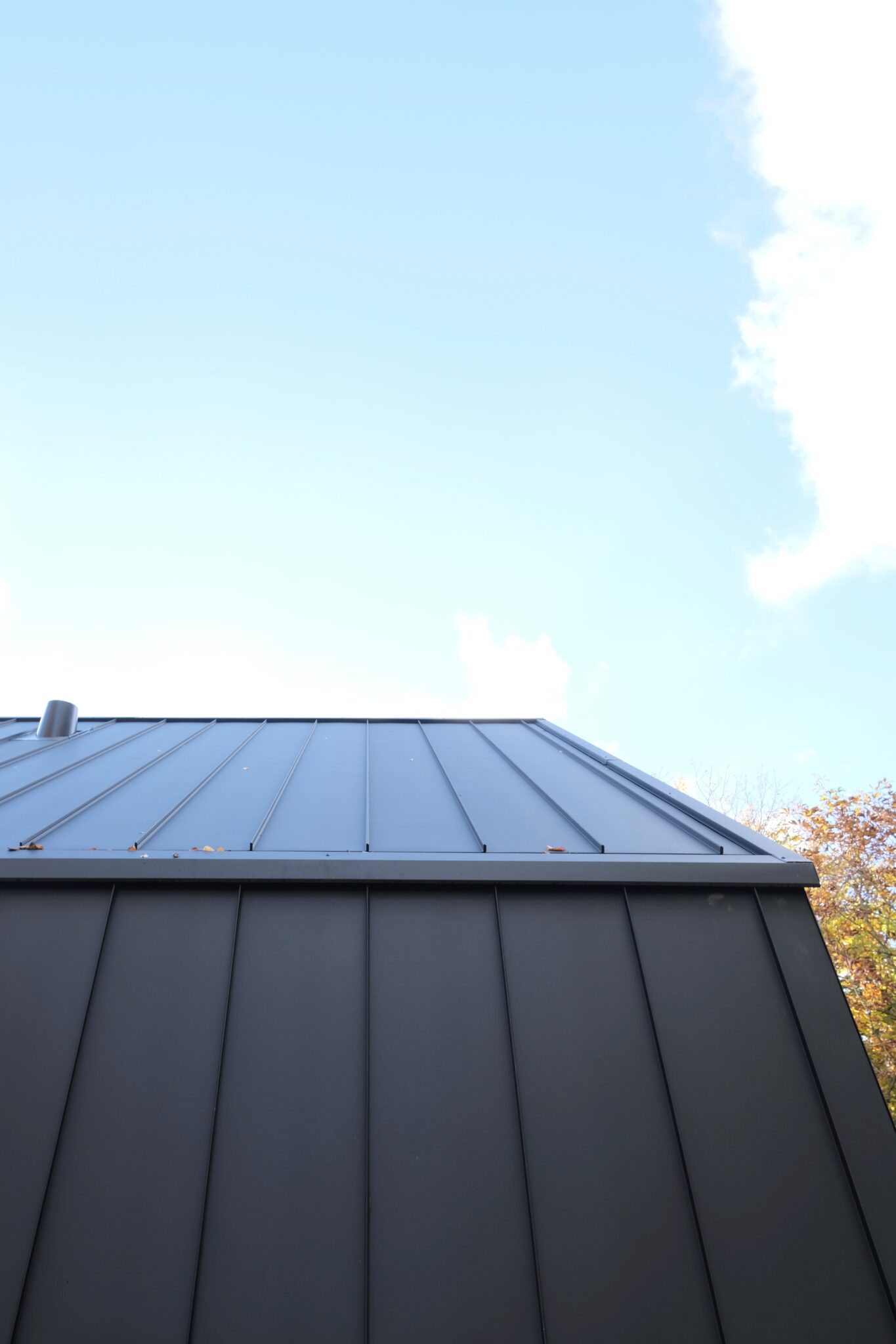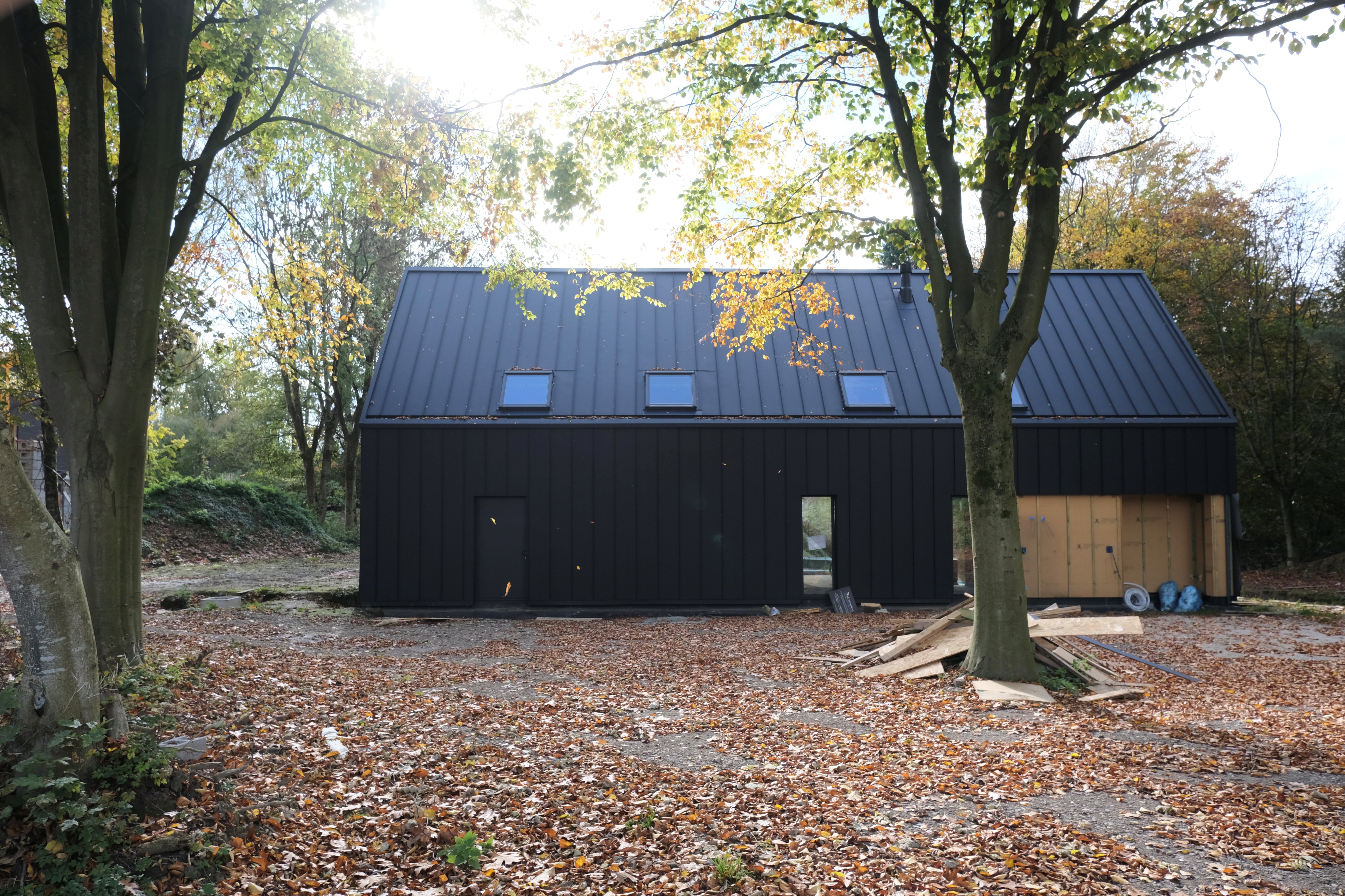 La maison est construite en ossature bois et recouverte d’un bardage métallique noir ainsi que de touches de bois à l’extérieur.