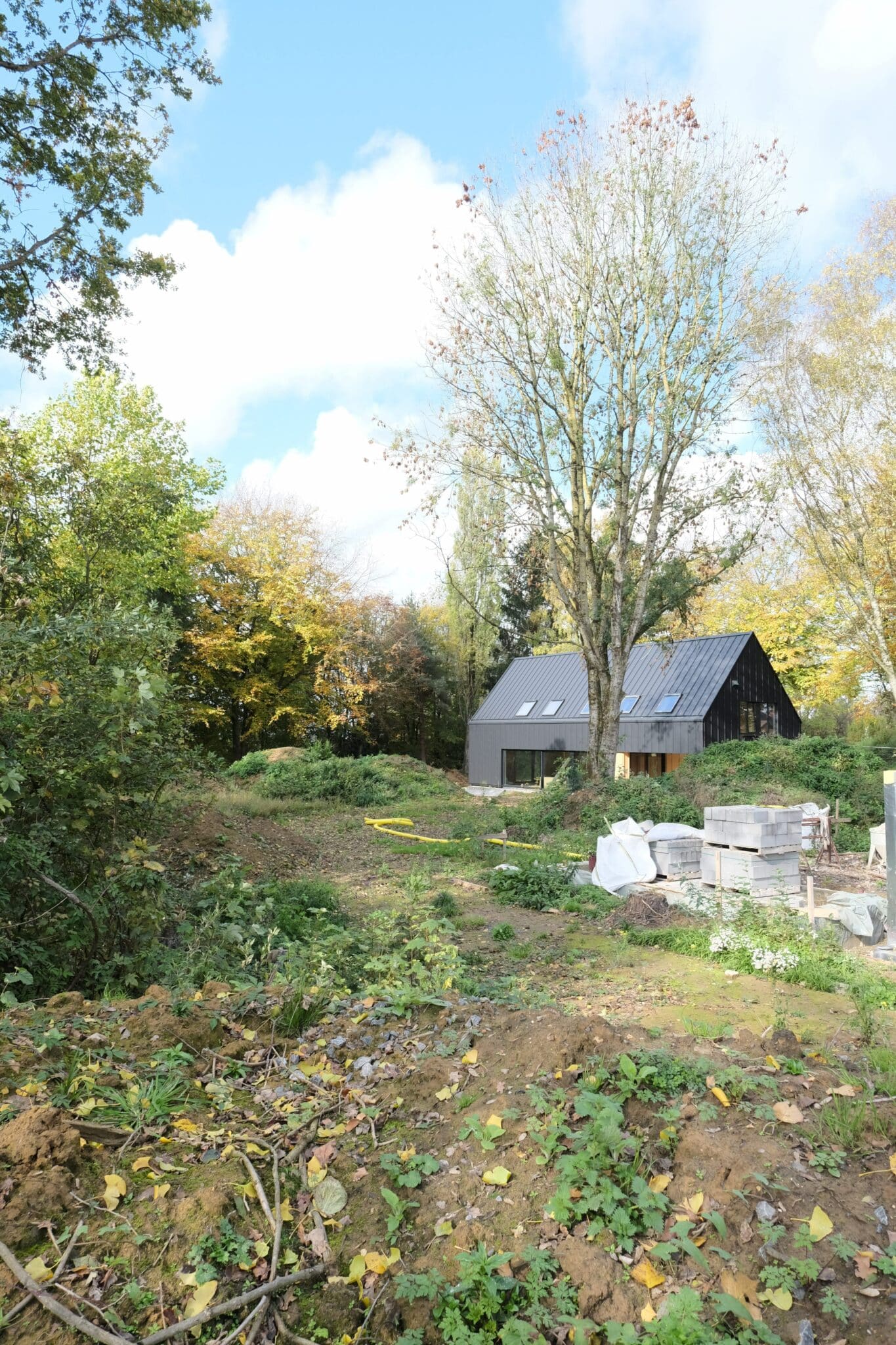Cette habitation s’implante dans un espace boisé à proximité du centre de Herve. Le volume se veut simple, intégrant l’ensemble de l’espace de nuit sous les toitures.