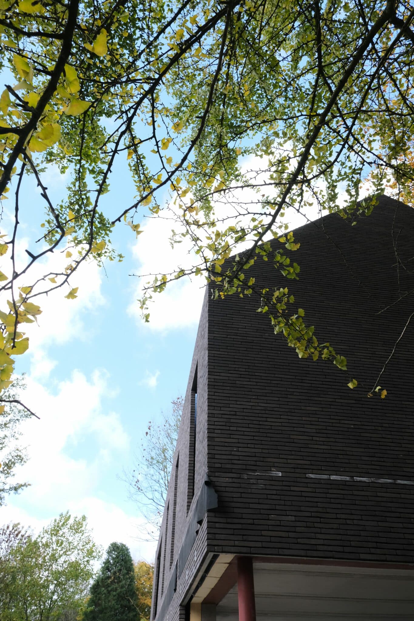 Les volumes se veulent simples, avec un volume principal en briques et un volume secondaire en bois, qui souligne son caractère structurel.