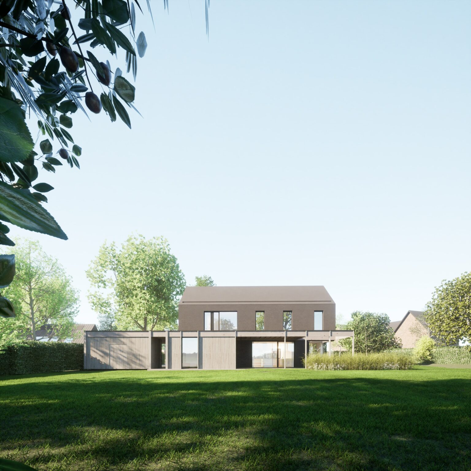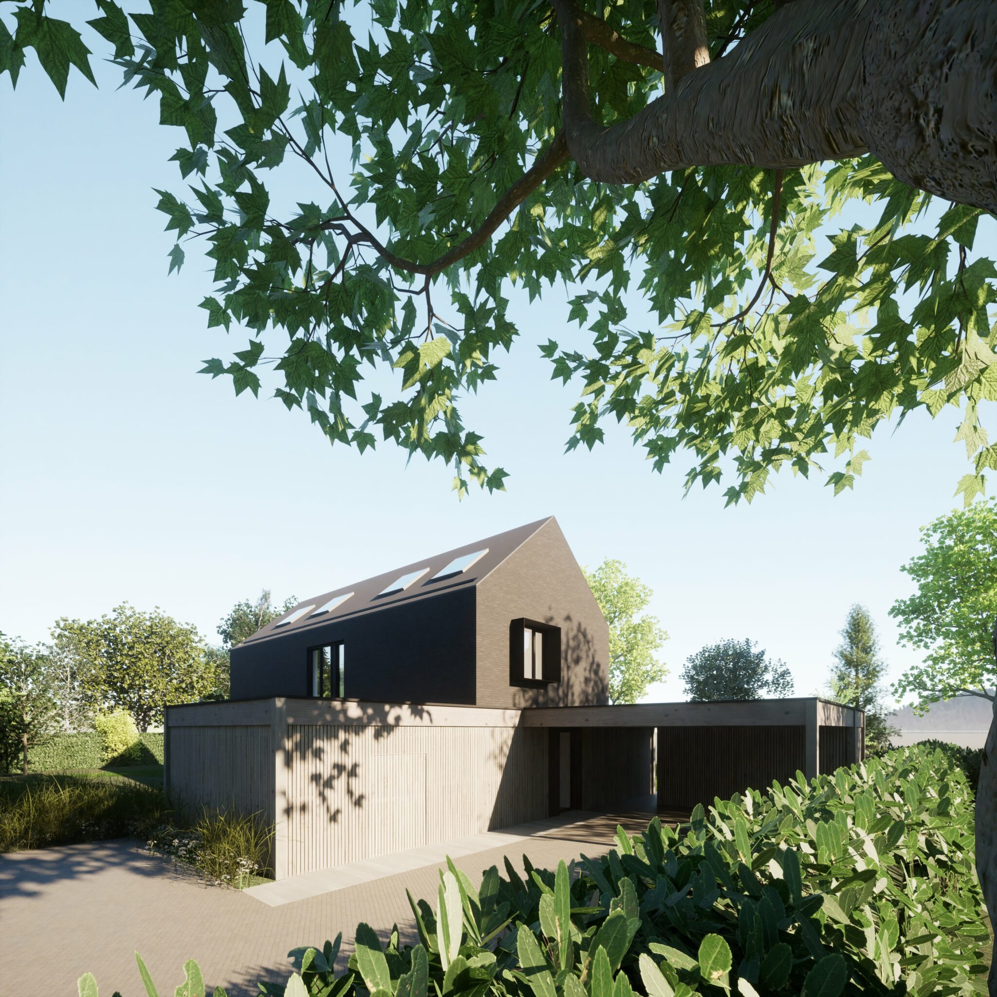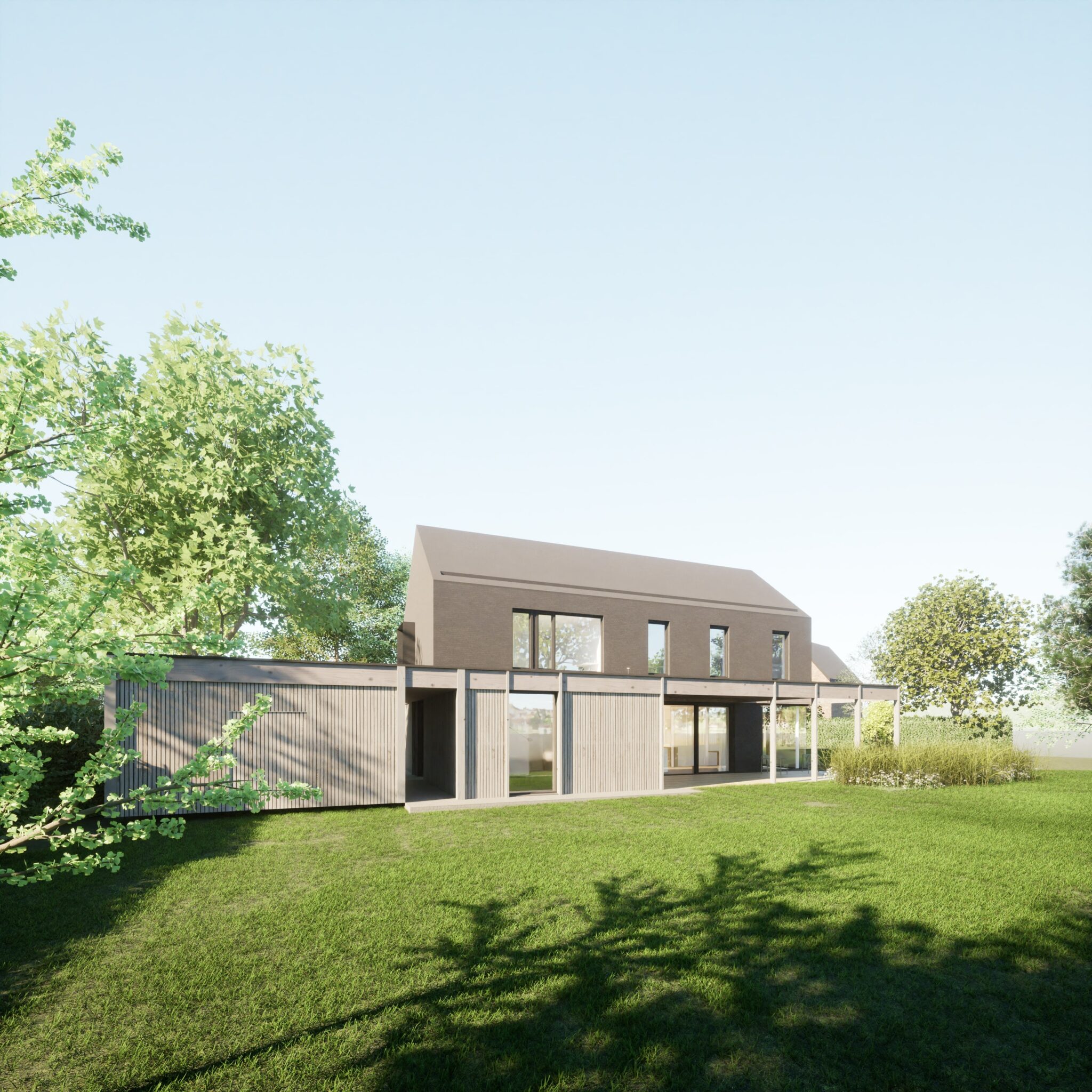 Ce volume secondaire relie les fonctions annexes — terrasses couvertes, protections solaires végétalisées, rangement jardin et carport — au séjour de l’habitation, créant une continuité entre les espaces de vie intérieurs et extérieurs.