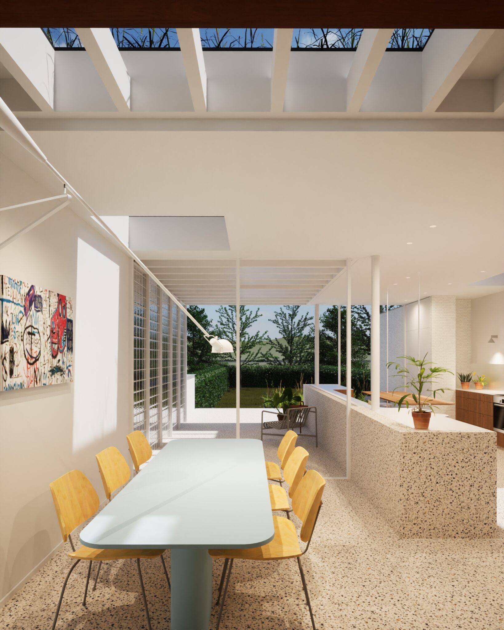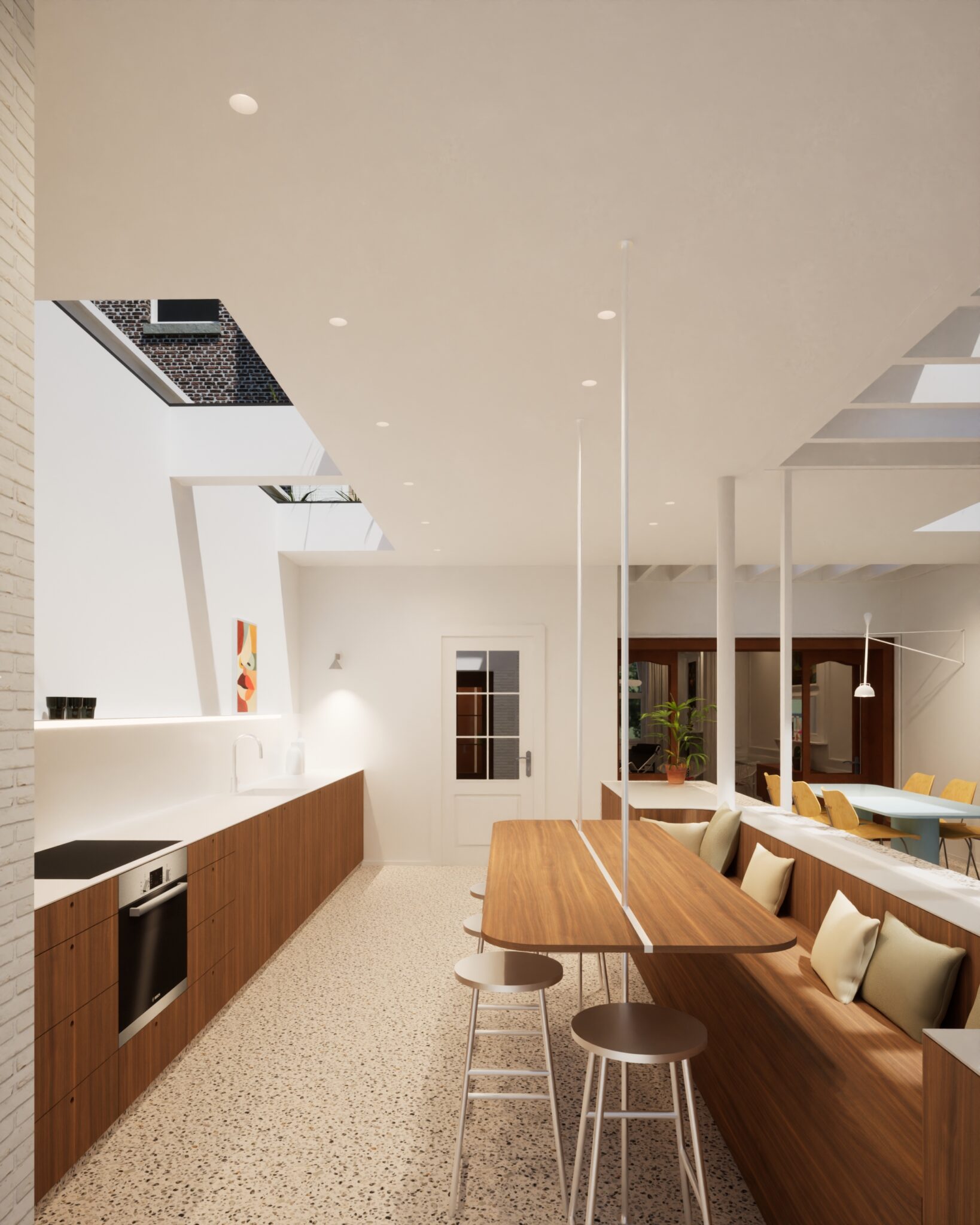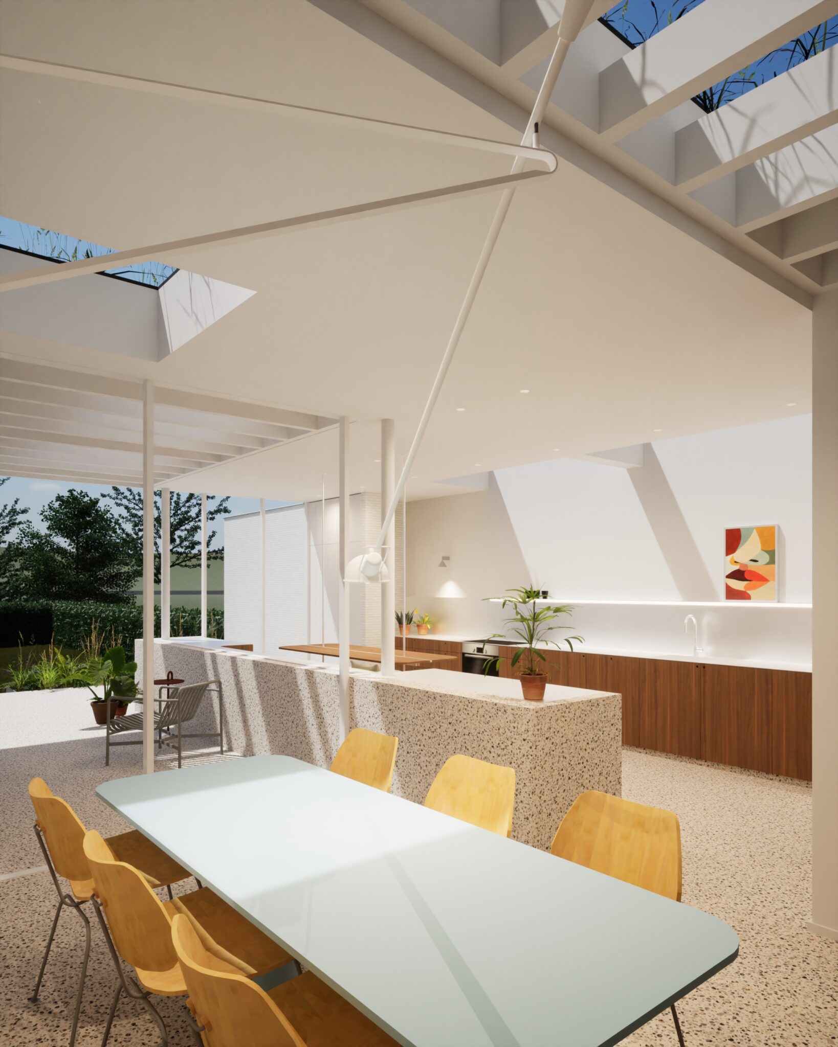 Les volumes annexes existants, vétustes, seront démolis et remplacés par une nouvelle annexe, destinée à accueillir la cuisine, la salle à manger et une terrasse couverte.