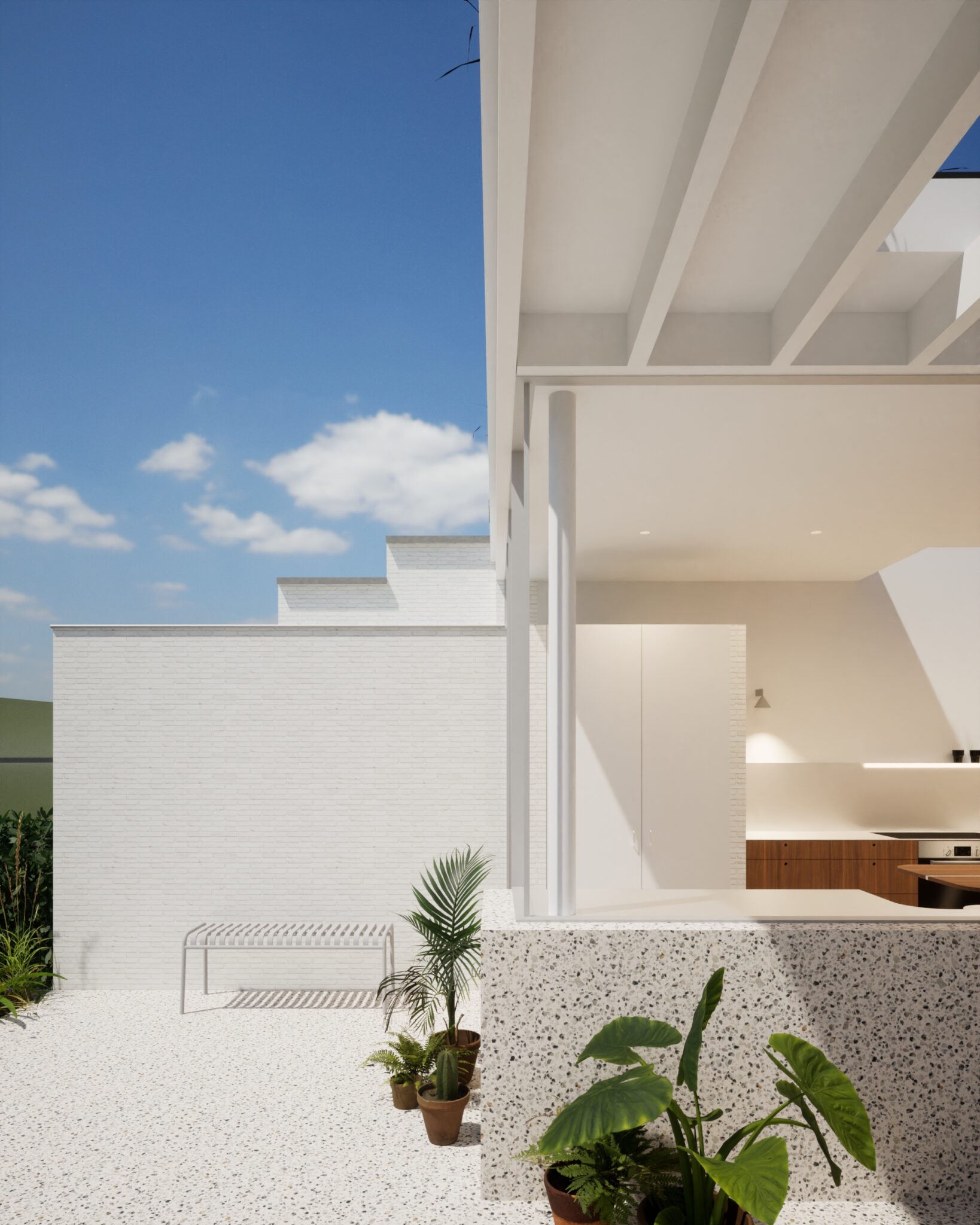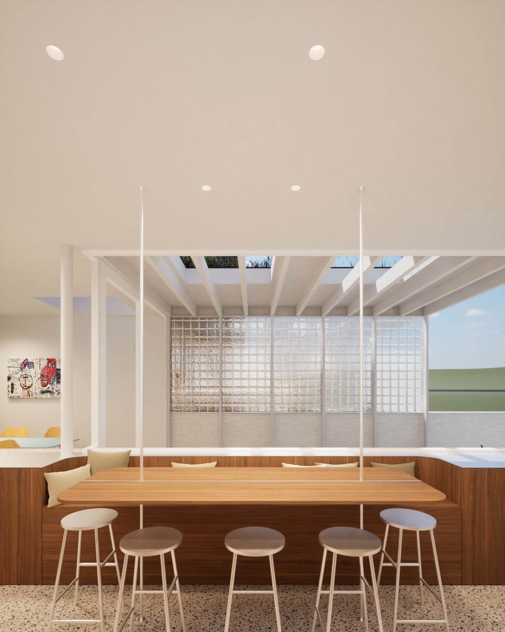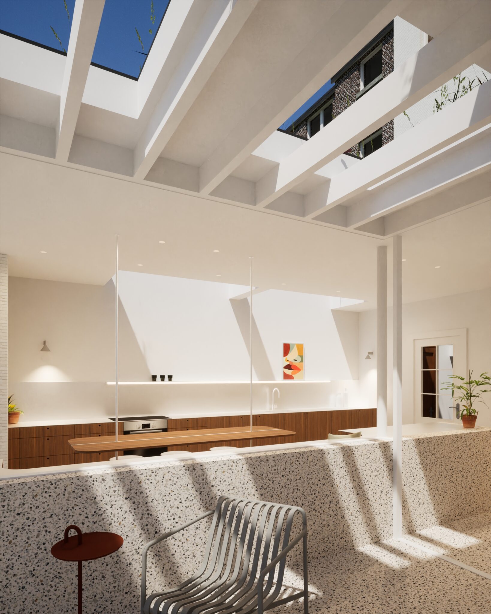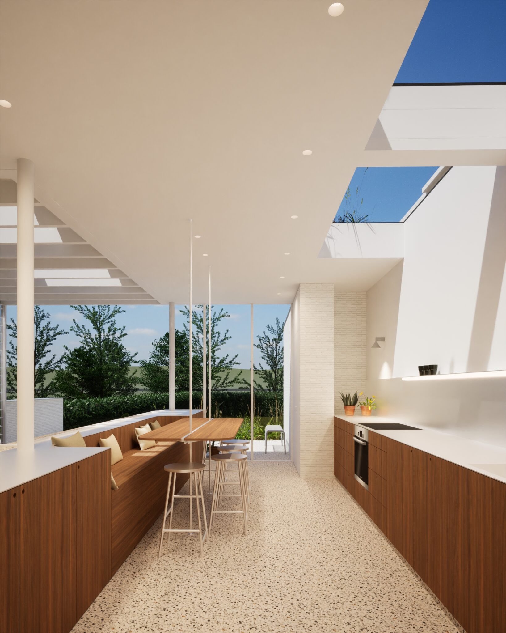 Les volumes annexes existants, vétustes, seront démolis et remplacés par une nouvelle annexe, destinée à accueillir la cuisine, la salle à manger et une terrasse couverte.