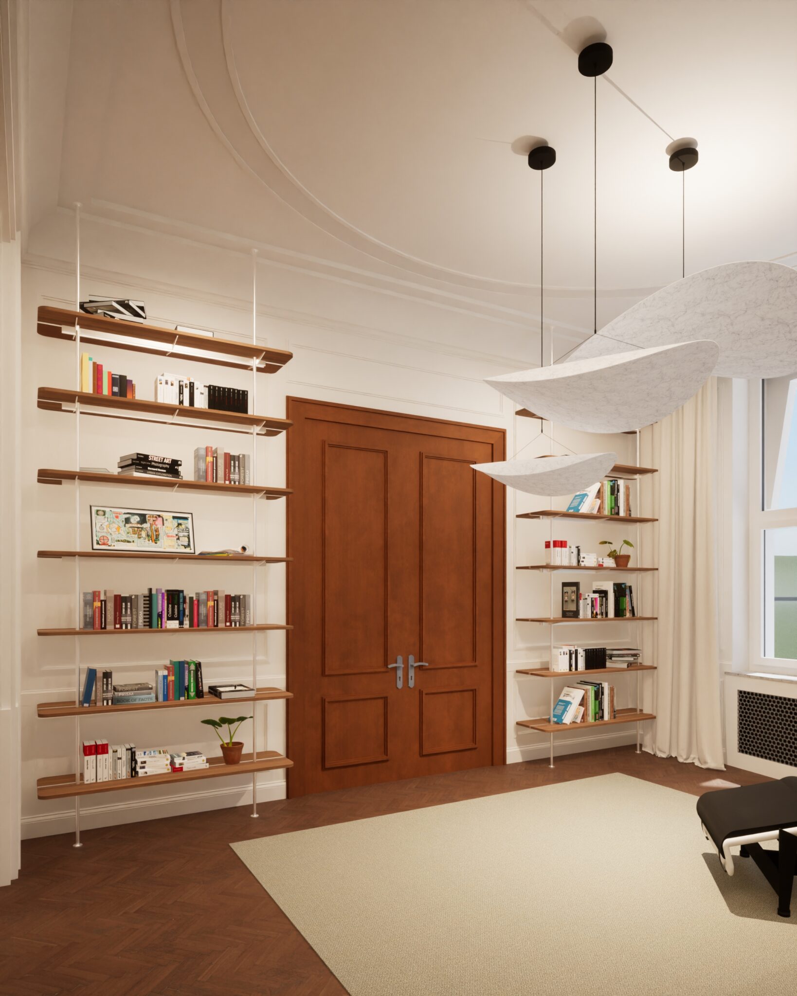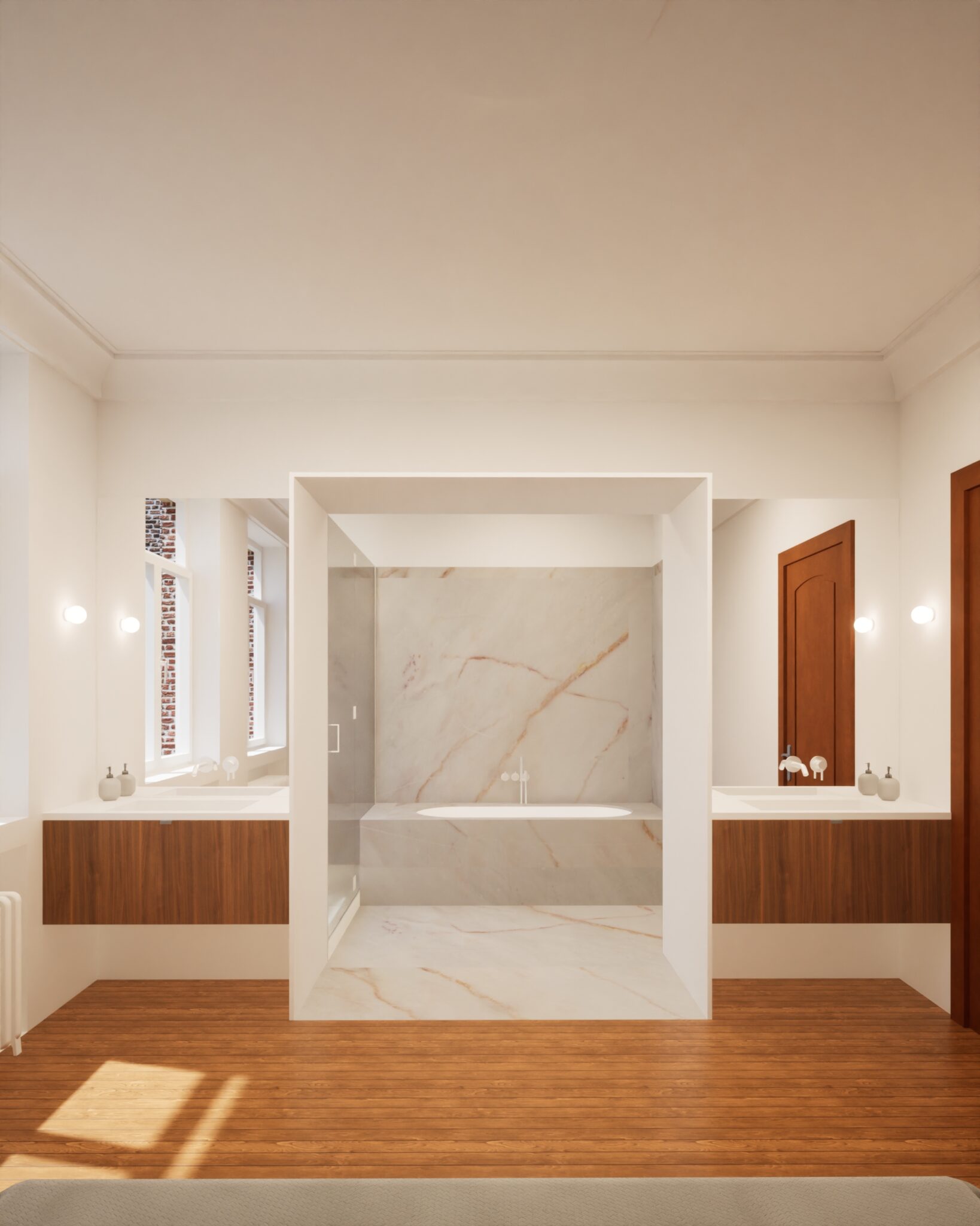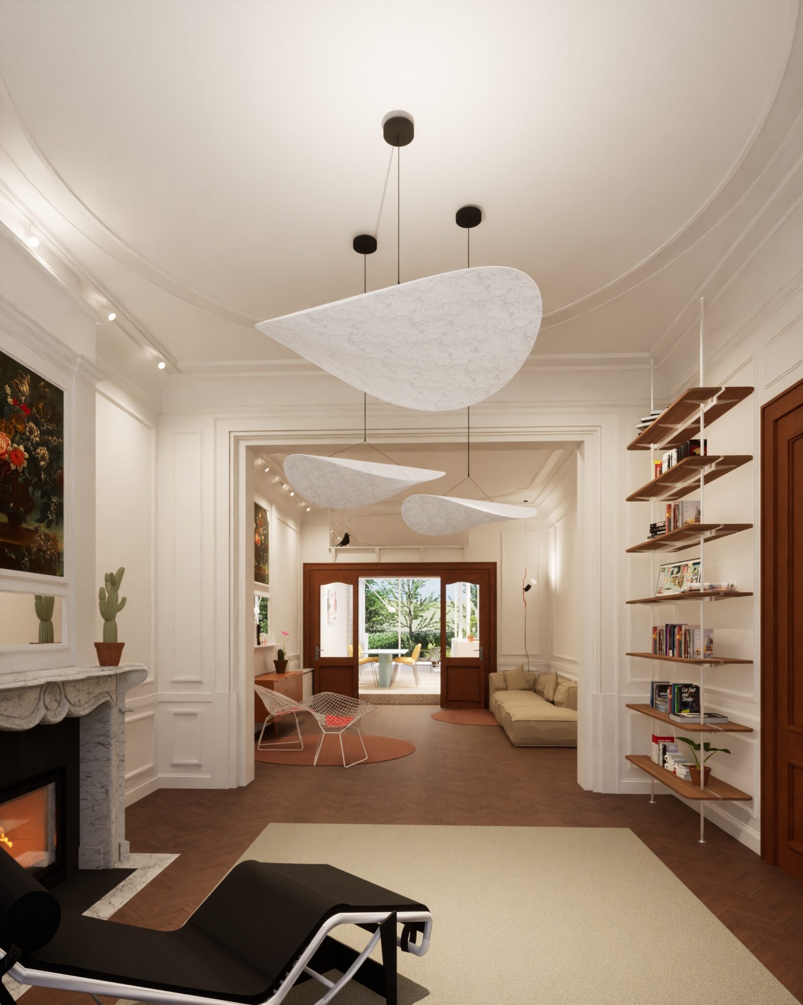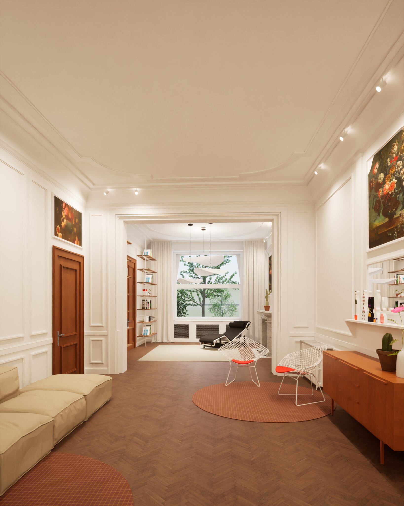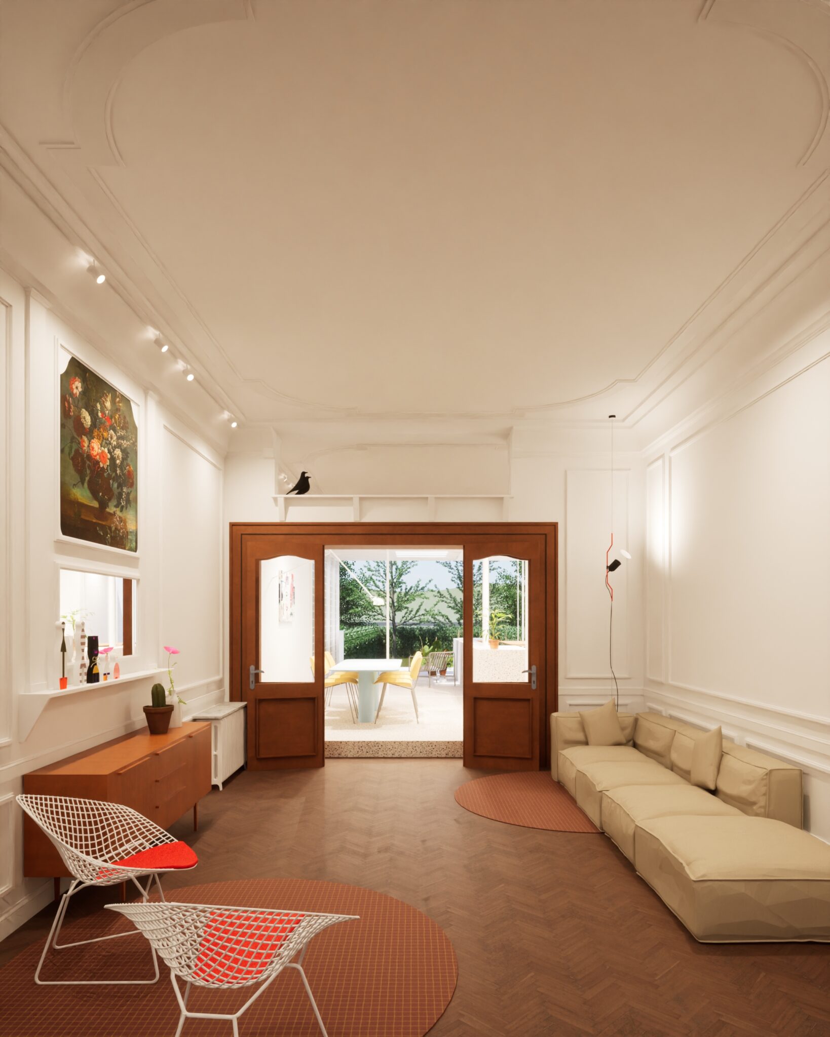 Les quatre niveaux de l’habitation sont entièrement repensés, en veillant à conserver au maximum les éléments architecturaux de qualité existants, tels que les moulures, boiseries et parquets.
