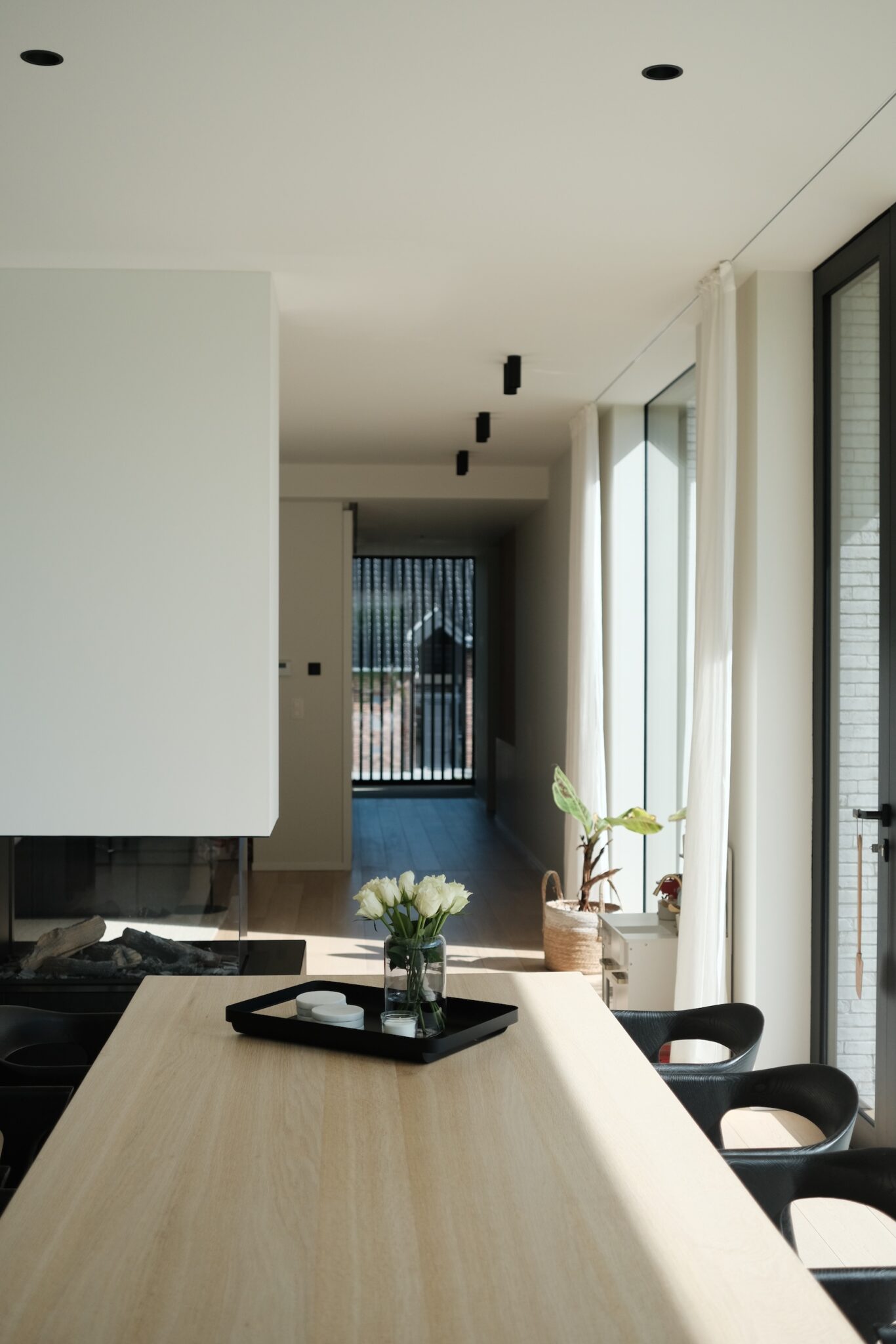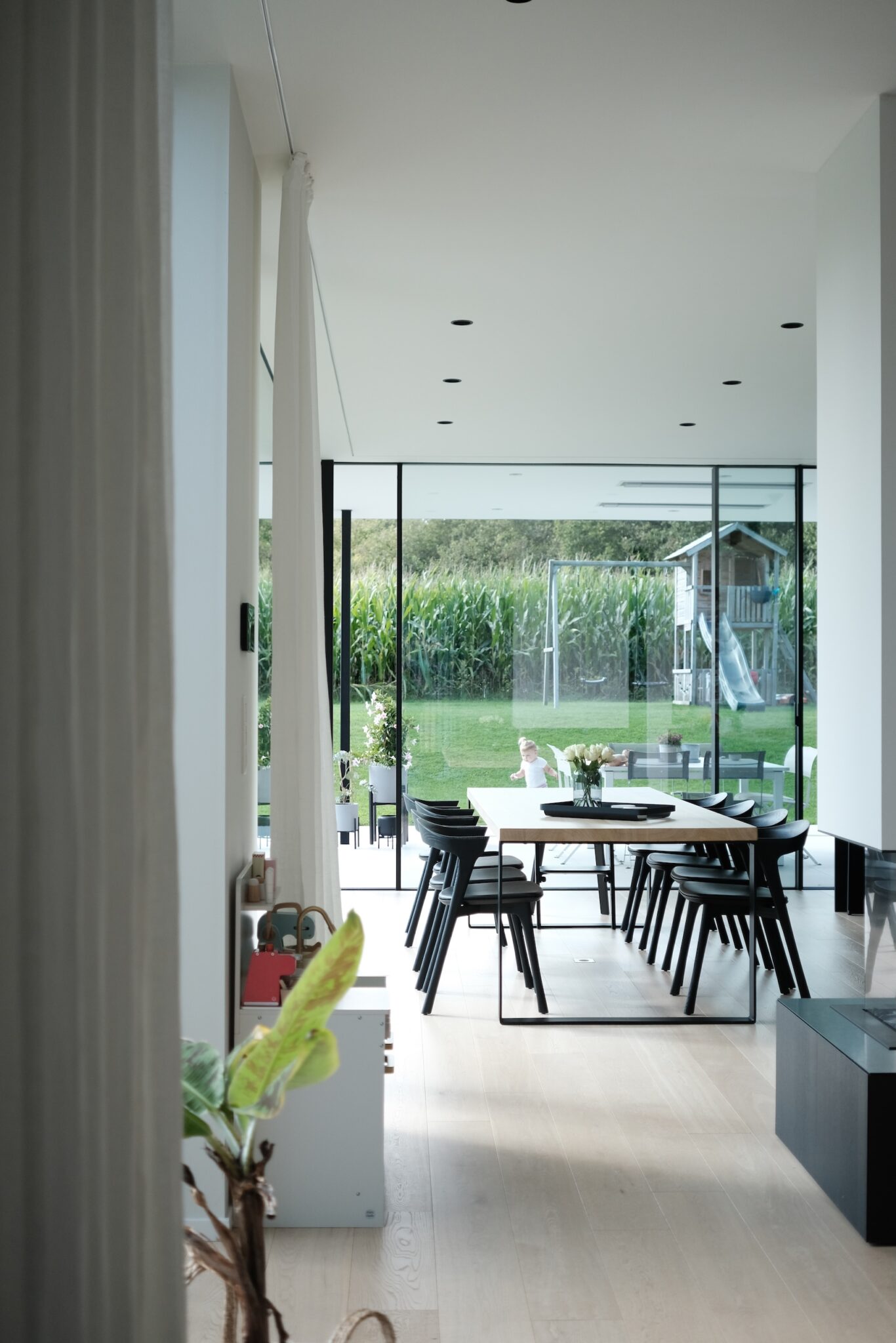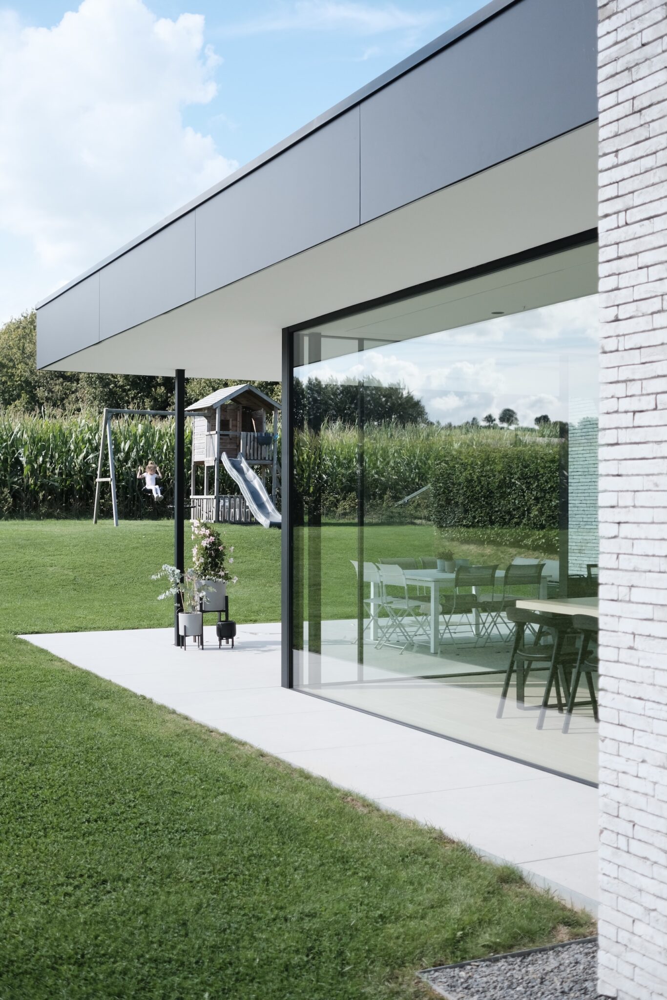Le niveau de nuit prend place au-dessus de ce volume, tandis qu’un jeu de demi-niveaux permet d’implanter le niveau de vie à côté, en lien direct avec le jardin.