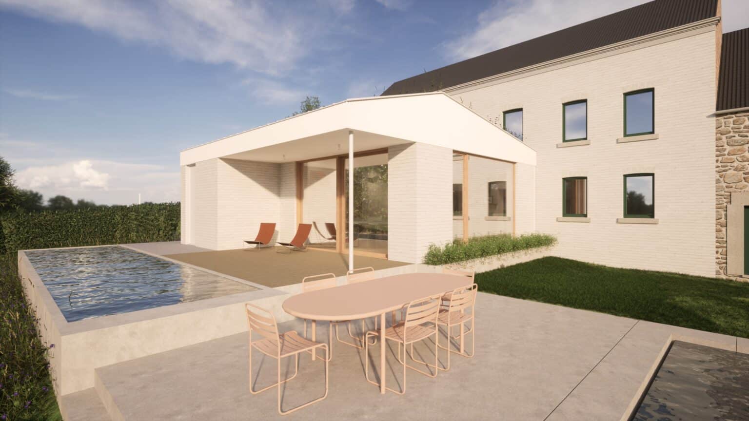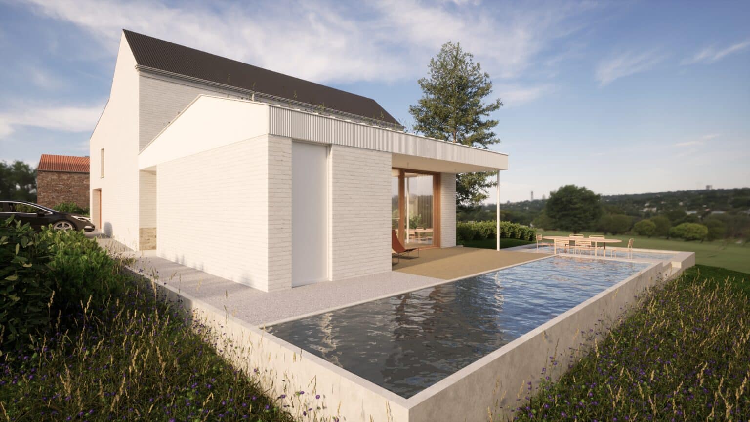 Le projet intègre également des aménagements extérieurs comprenant une terrasse couverte, un bassin et une piscine avec terrasse, pour renforcer le lien entre l’habitation et son environnement.
