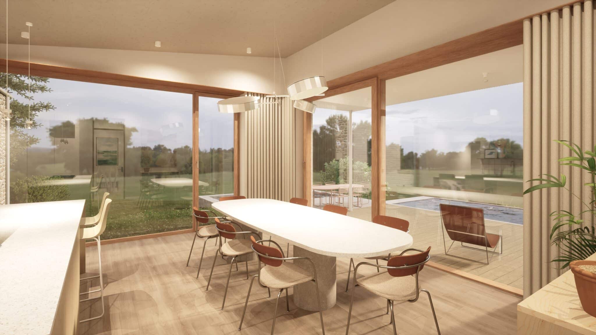 Elle accueille également les nouveaux espaces de vie — cuisine et salle à manger — désormais plus ouverts, lumineux et tournés vers le paysage.