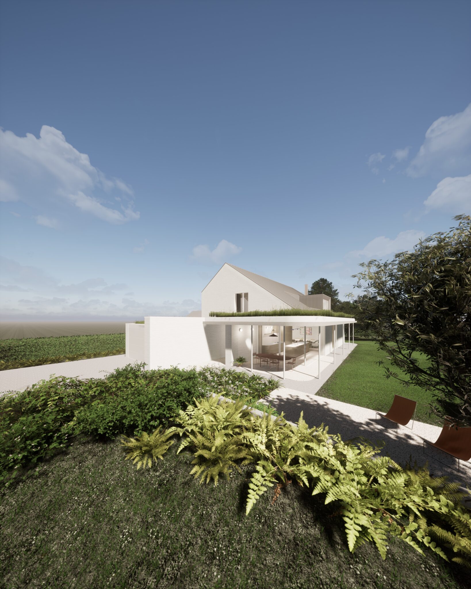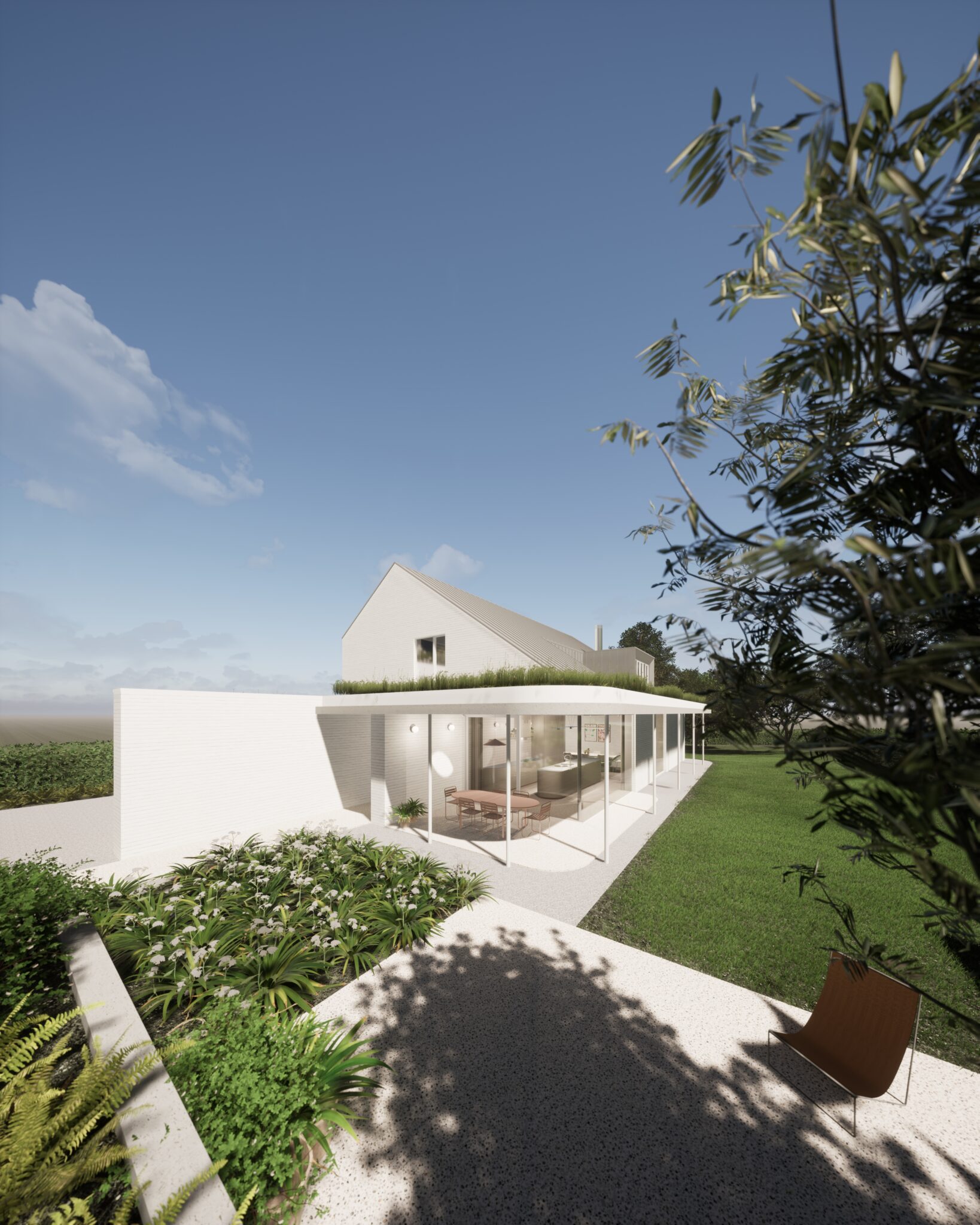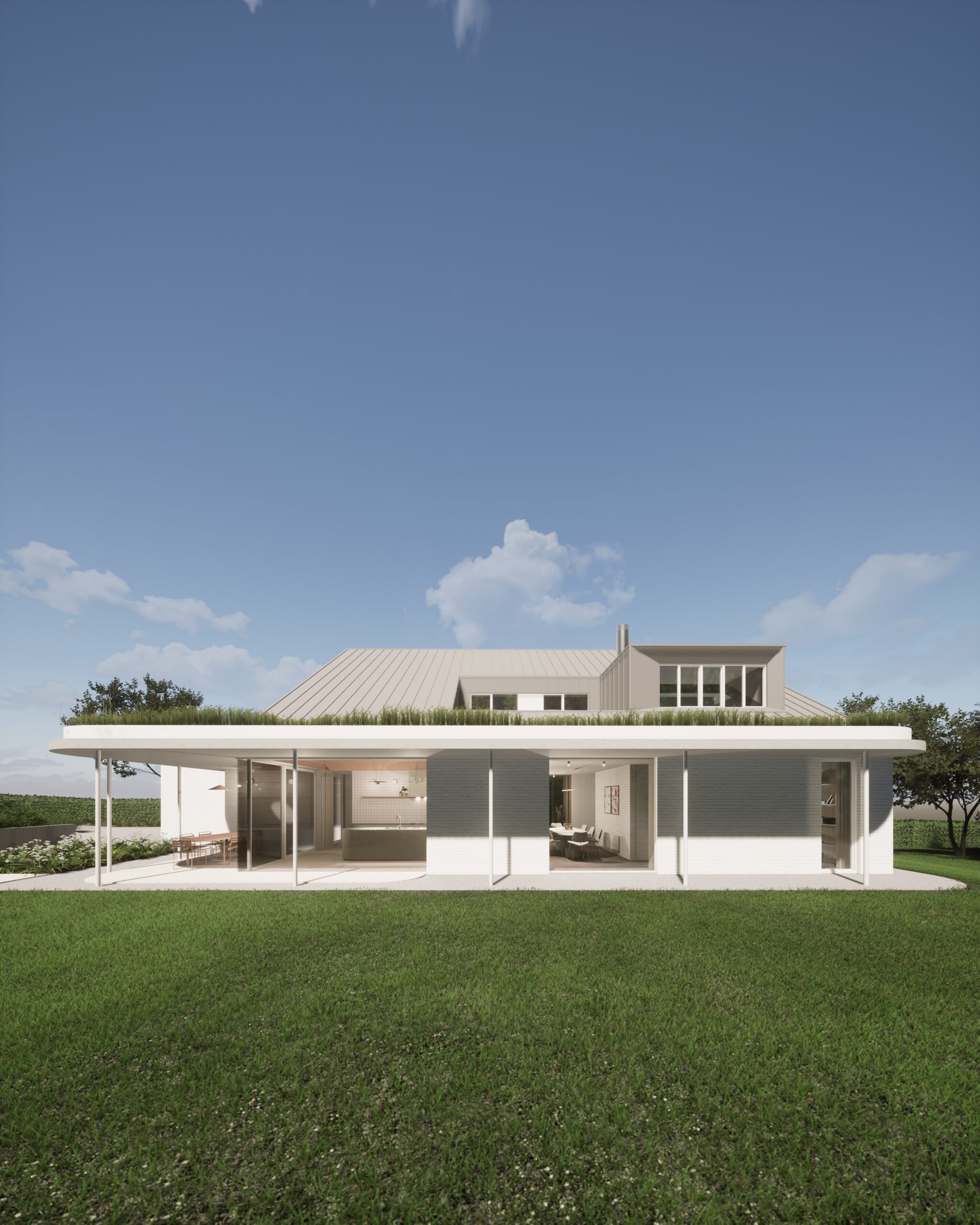 Les matériaux retenus — briques peintes en blanc, béton et zinc pour les toitures — apportent clarté et sobriété à l’ensemble.