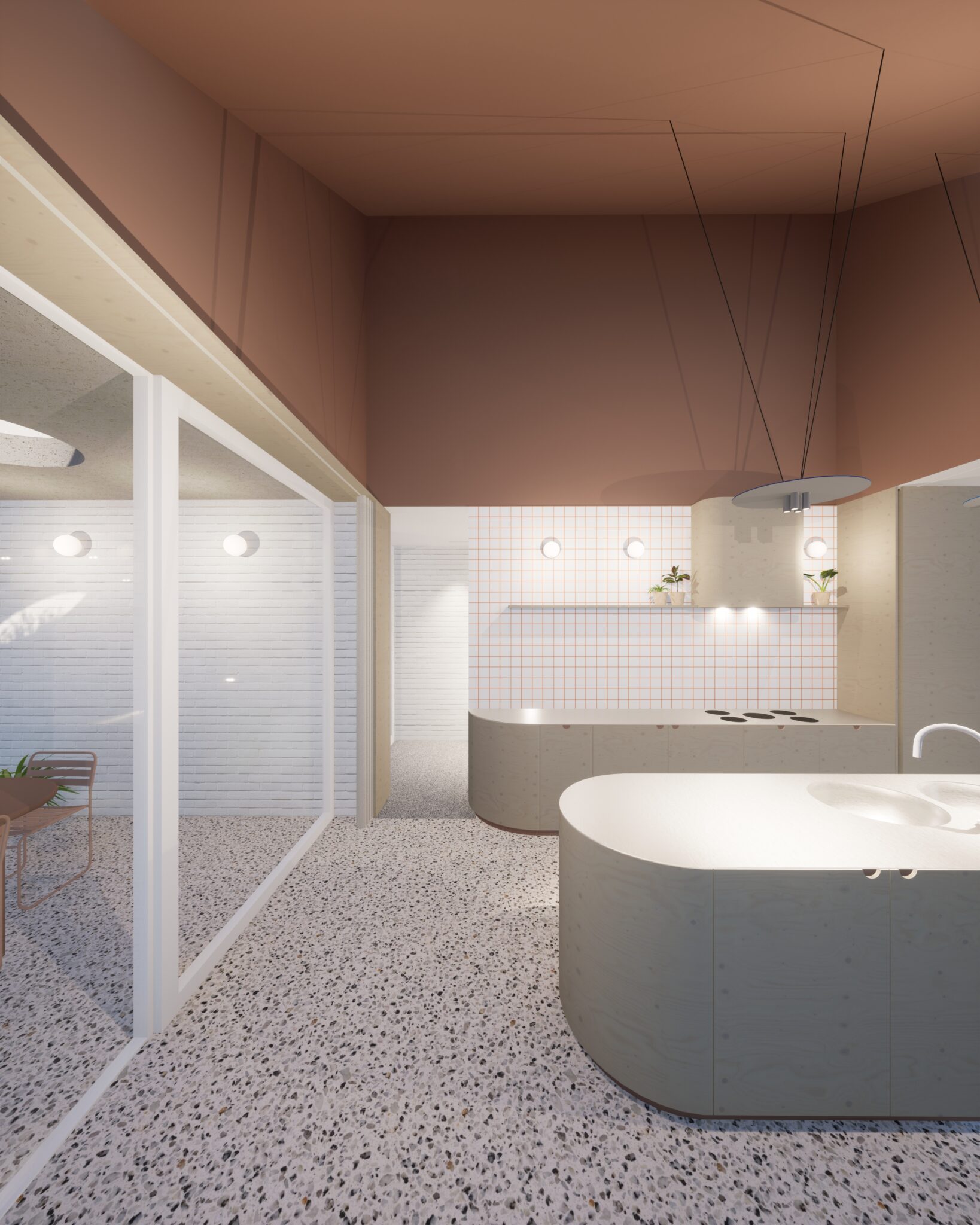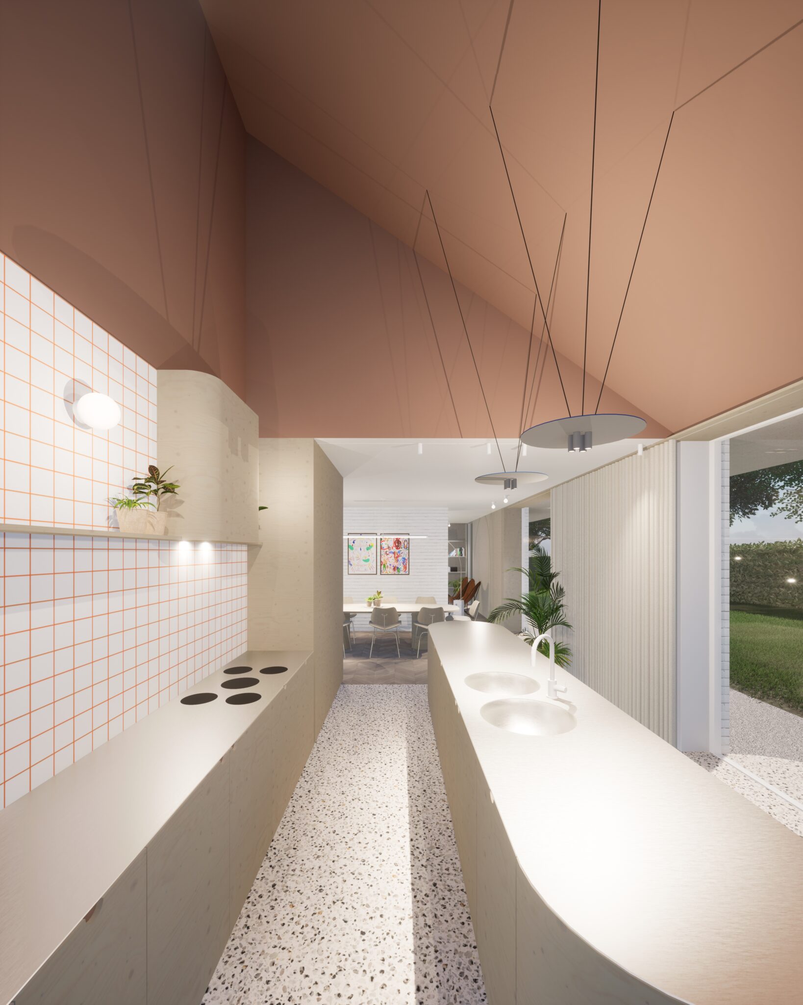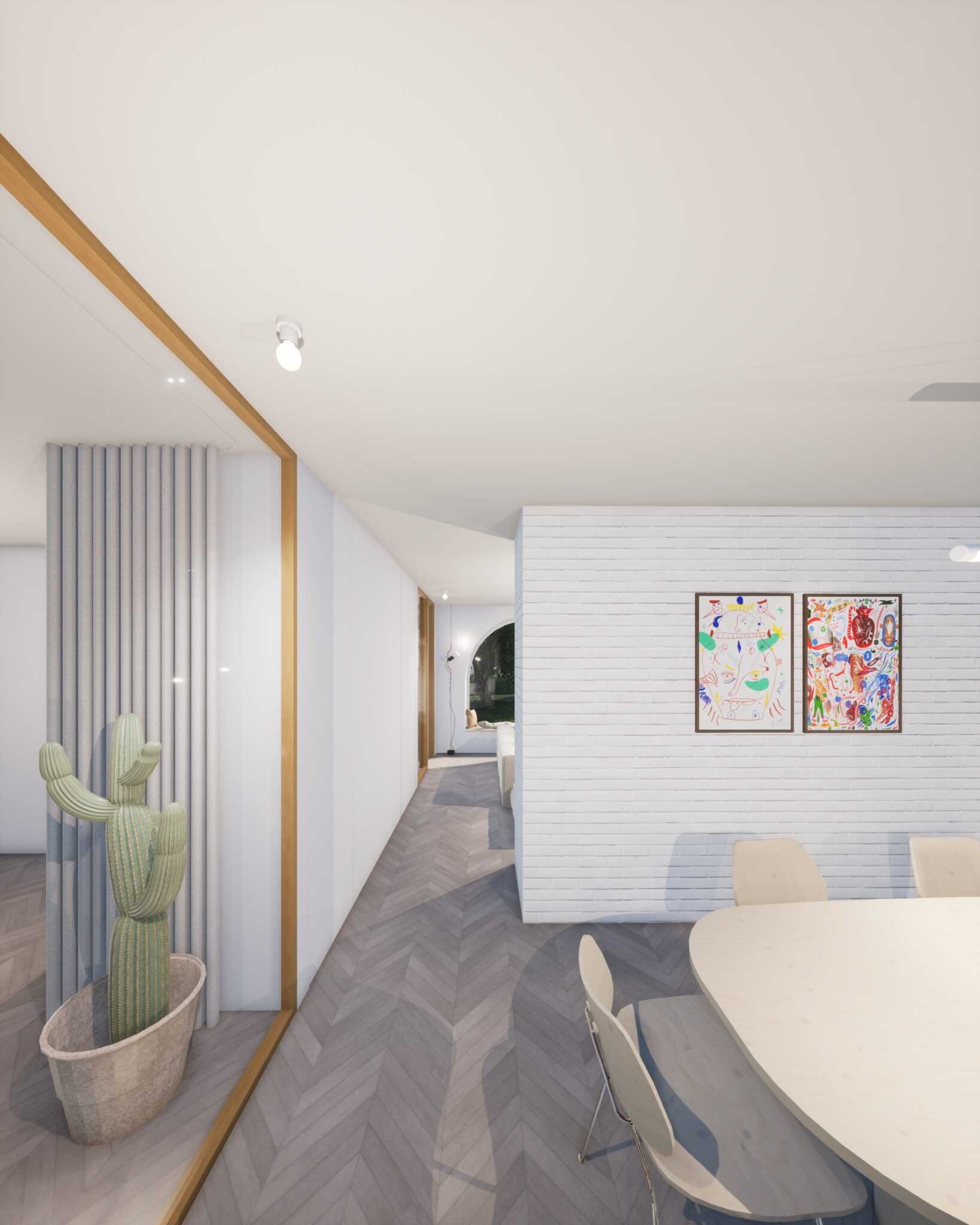 Les matériaux retenus — briques peintes en blanc, béton et zinc pour les toitures — apportent clarté et sobriété à l’ensemble.