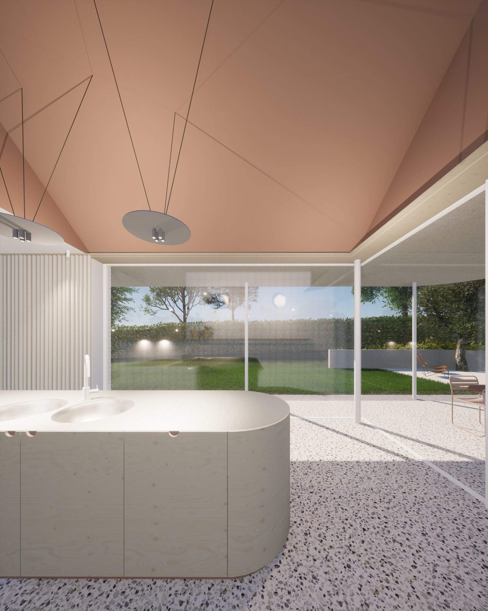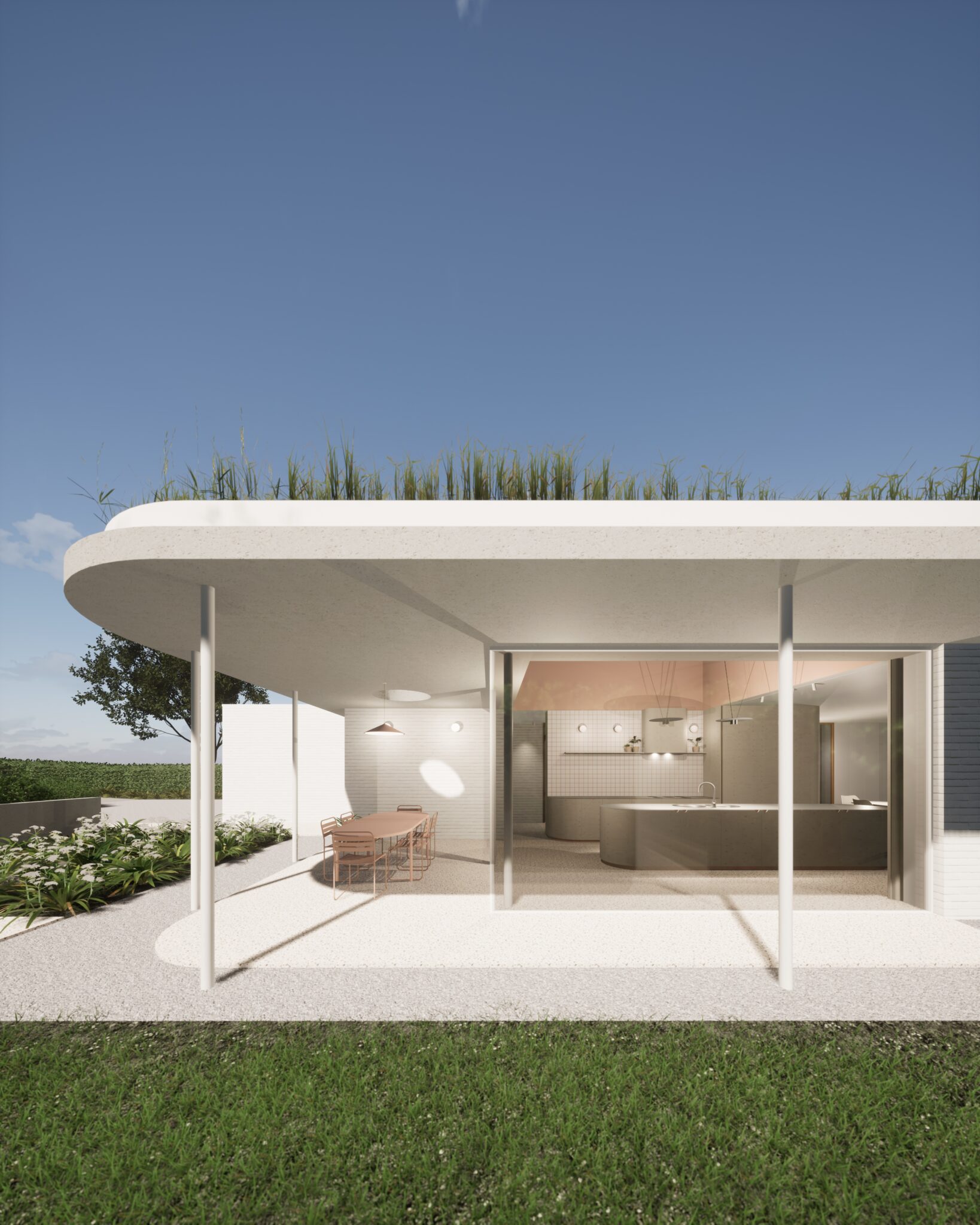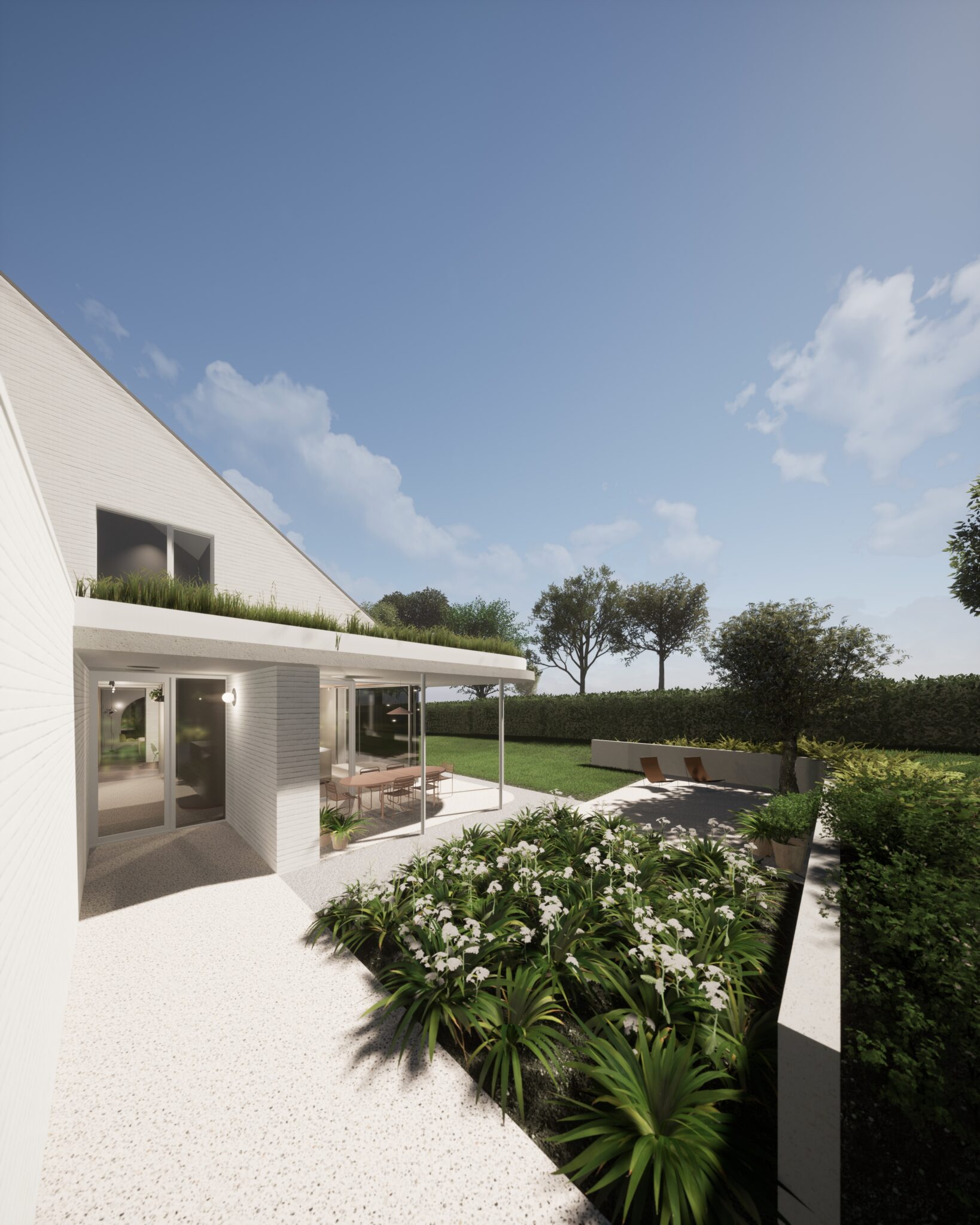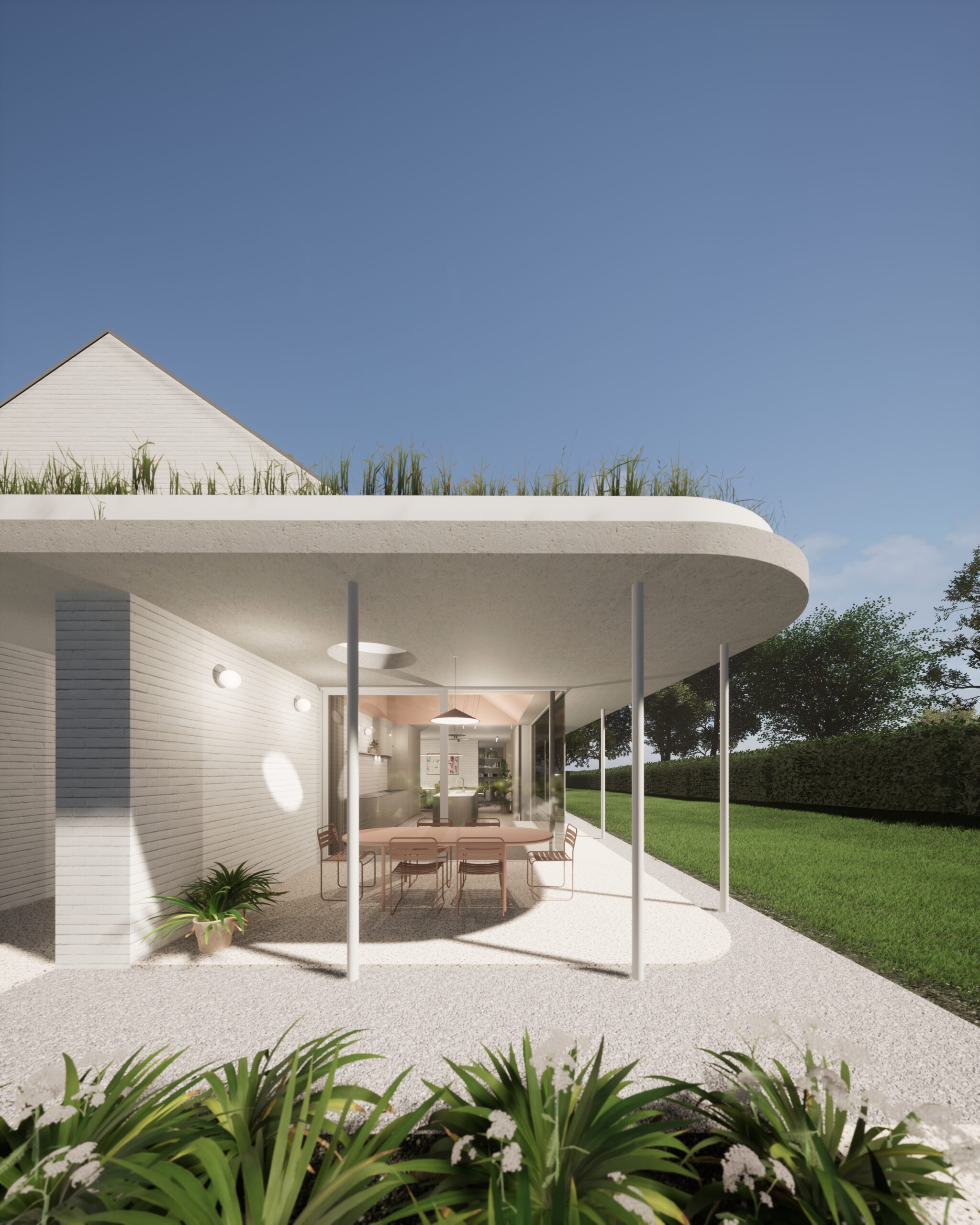 Les toitures plates prolongent le séjour vers l’extérieur tout en protégeant les baies vitrées de la surchauffe et en intégrant un espace de terrasse couverte.