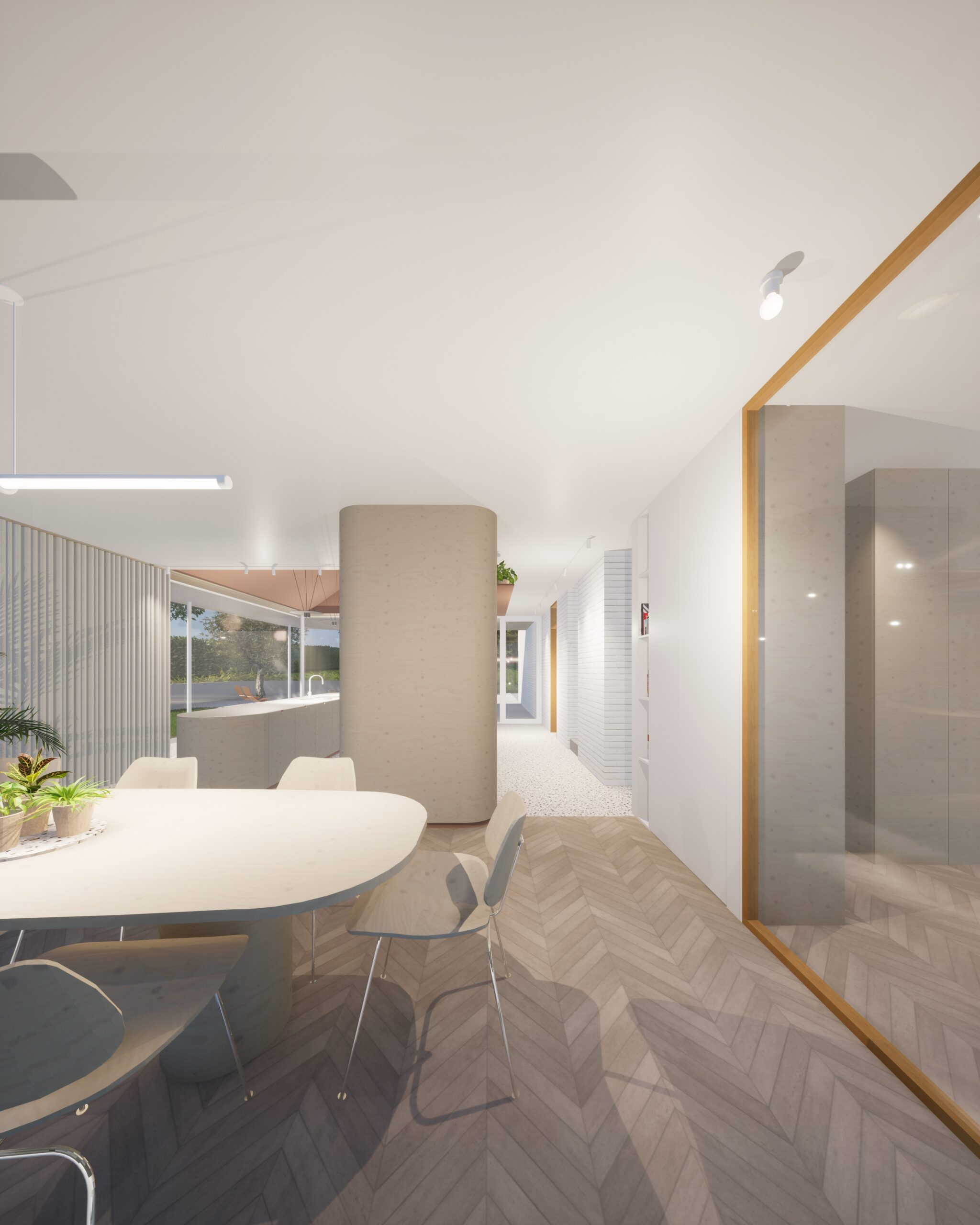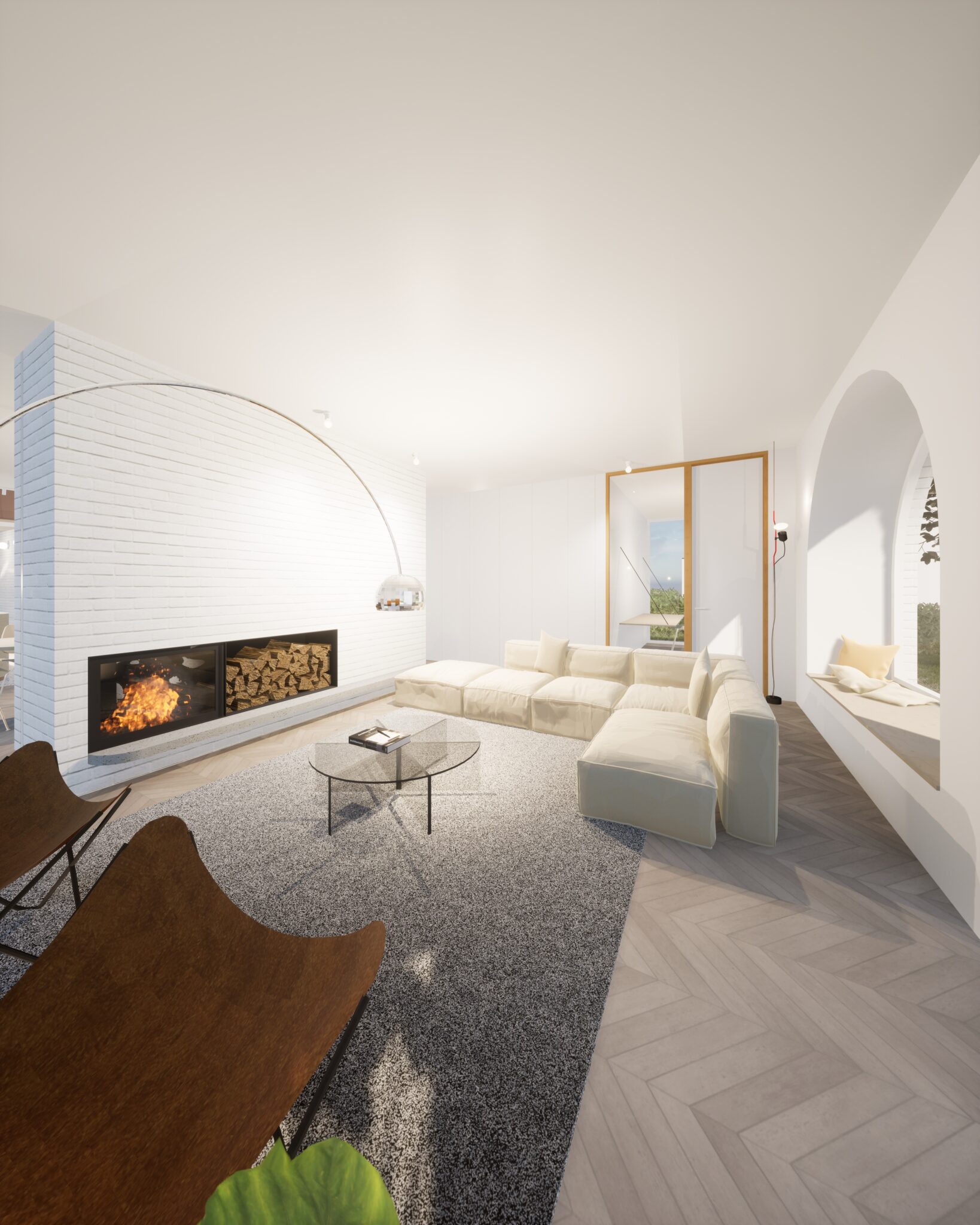 Le niveau de séjour s’ouvre largement vers l’extérieur, offrant des cadrages sur les différentes orientations et maximisant la lumière naturelle.