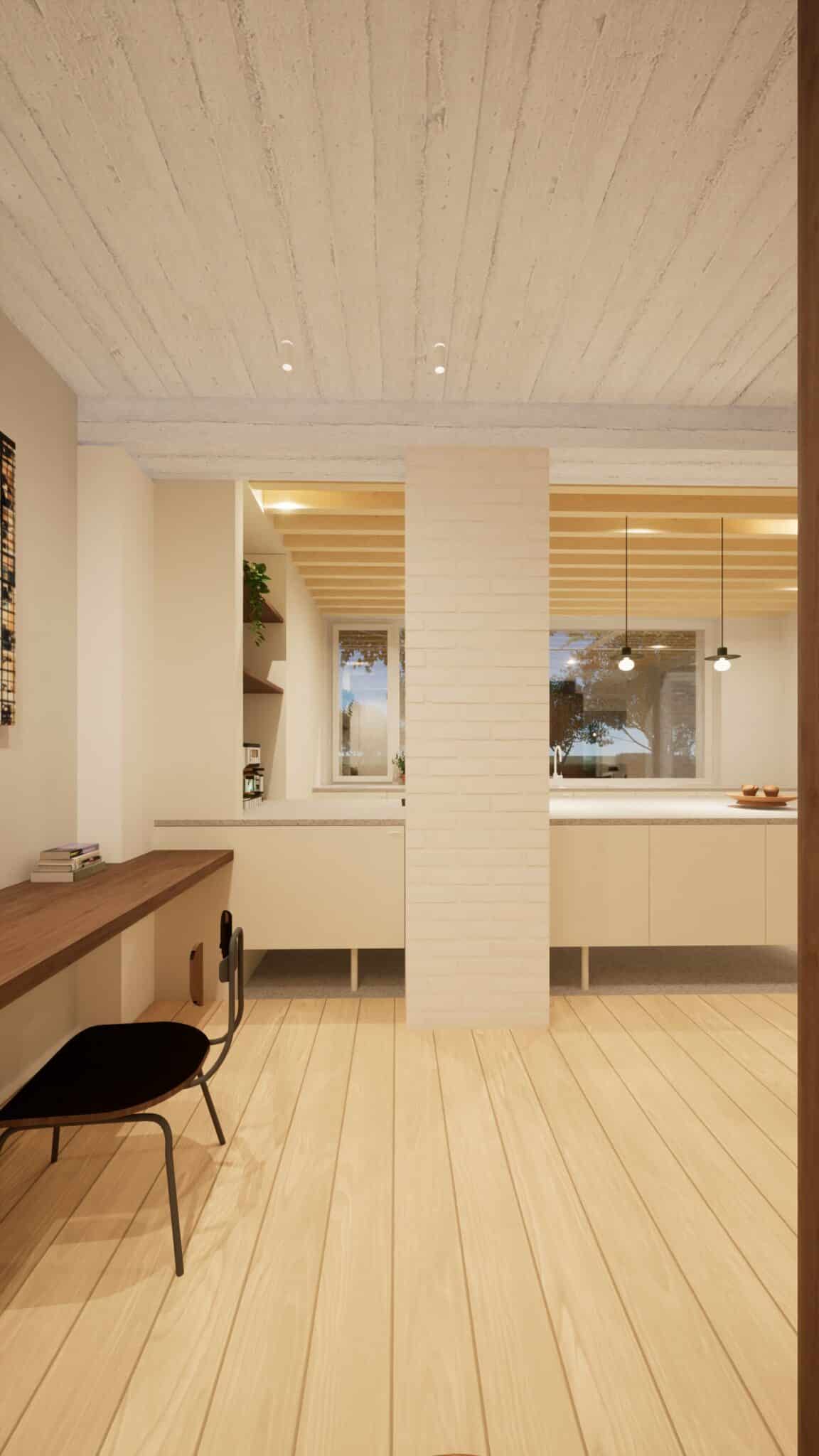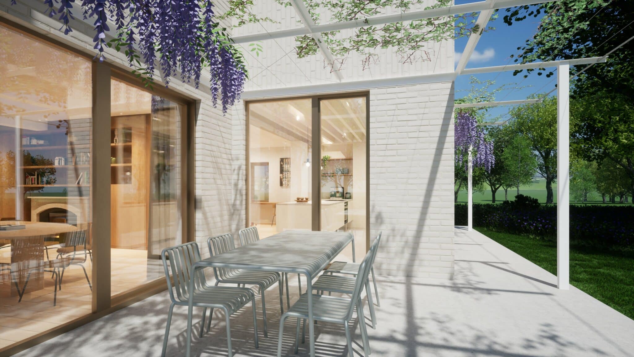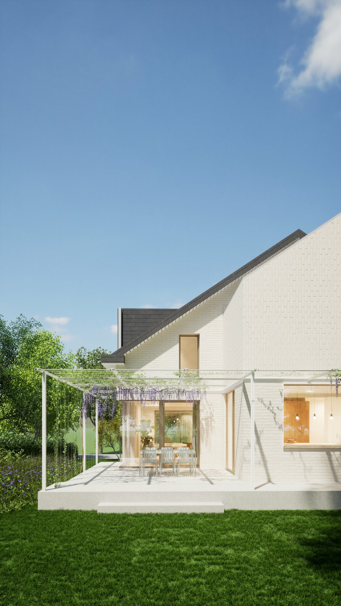 L’amélioration de la performance énergétique constitue un aspect essentiel du projet, notamment grâce à l’isolation des murs par l’extérieur, rendue possible par le démontage et la remise en place des briques de parement. Enfin, une structure métallique légère, destinée à accueillir des plantes grimpantes, viendra créer une terrasse ombragée tout en protégeant les nouvelles baies vitrées de la chaleur estivale.