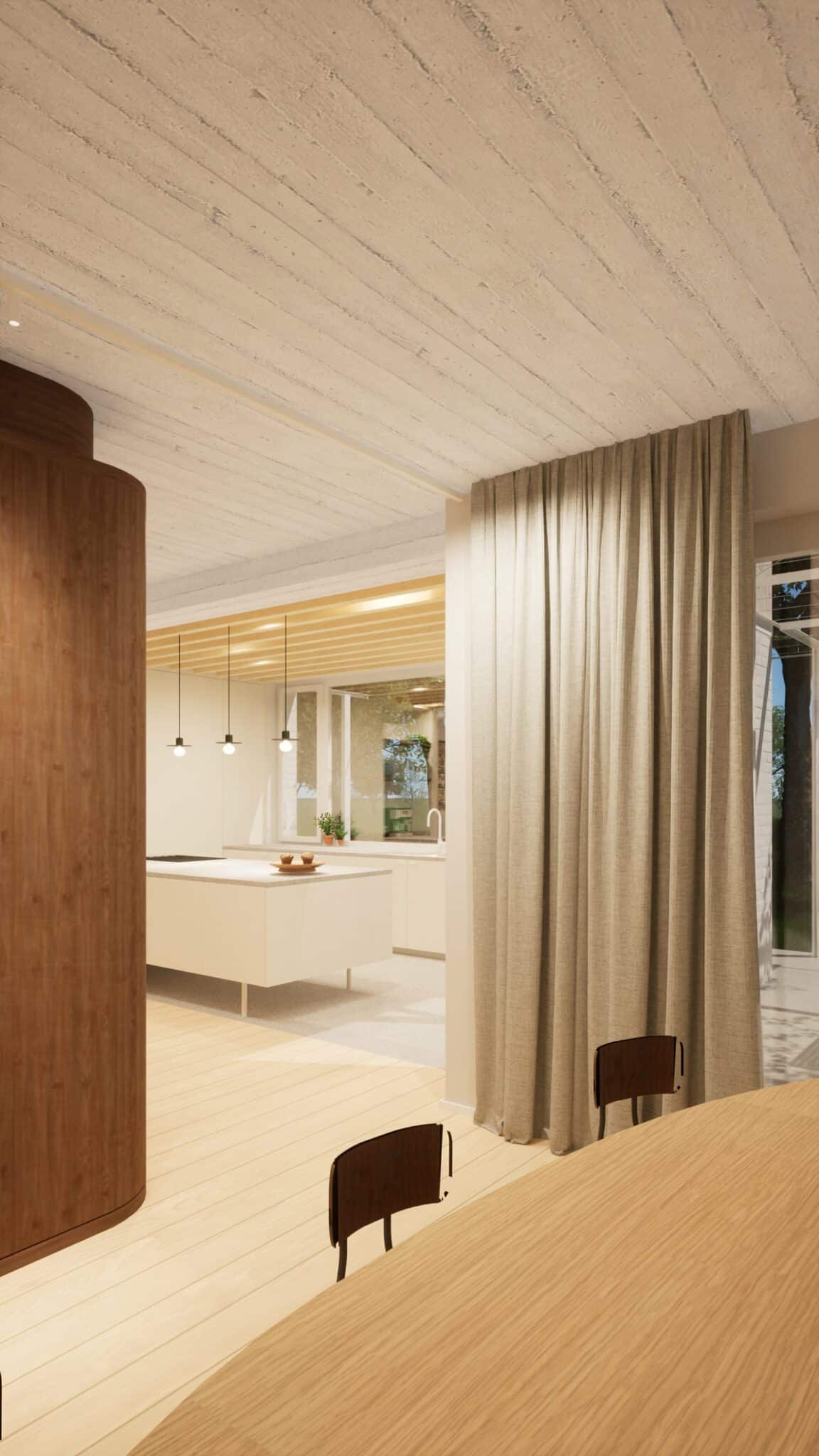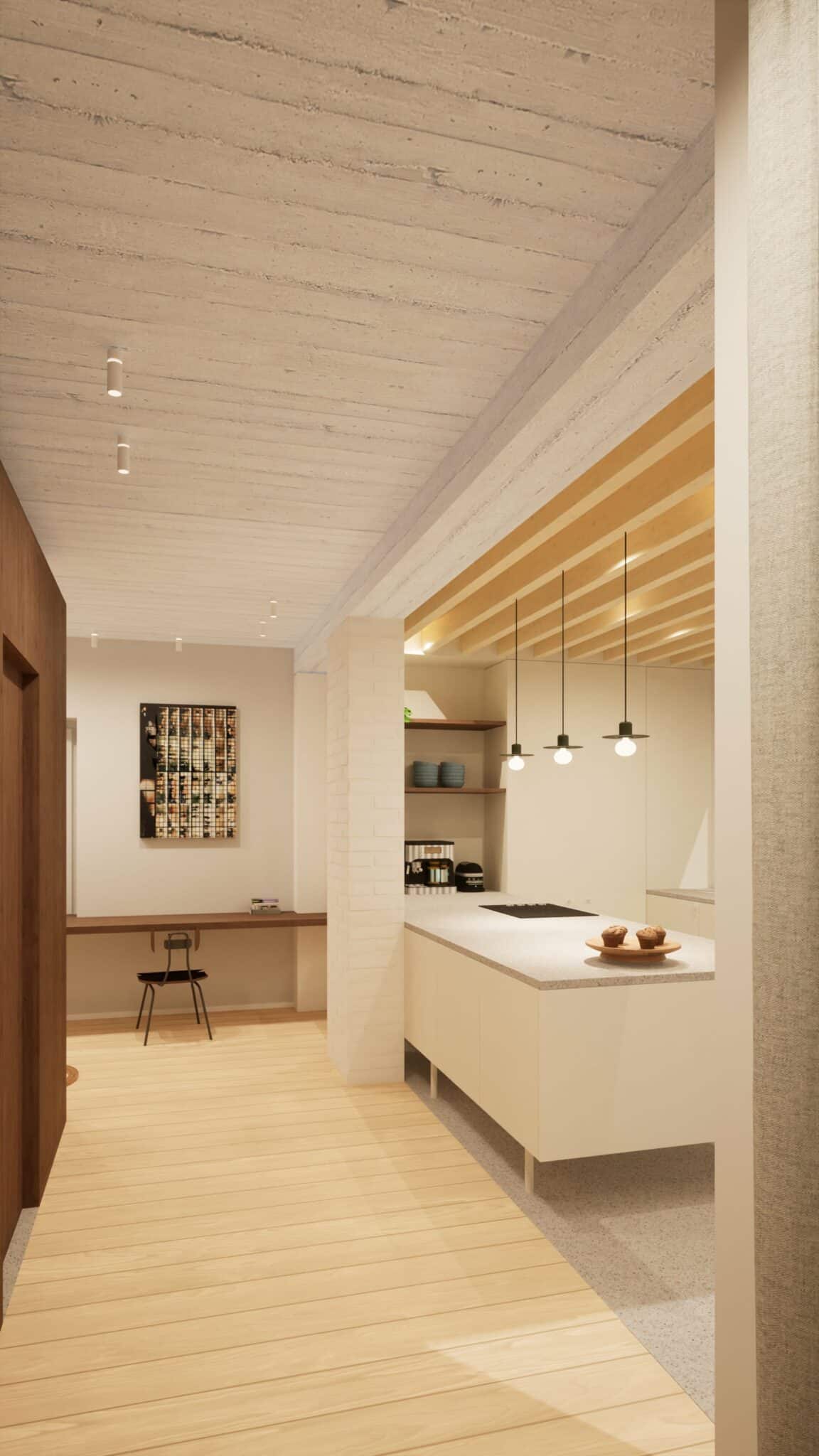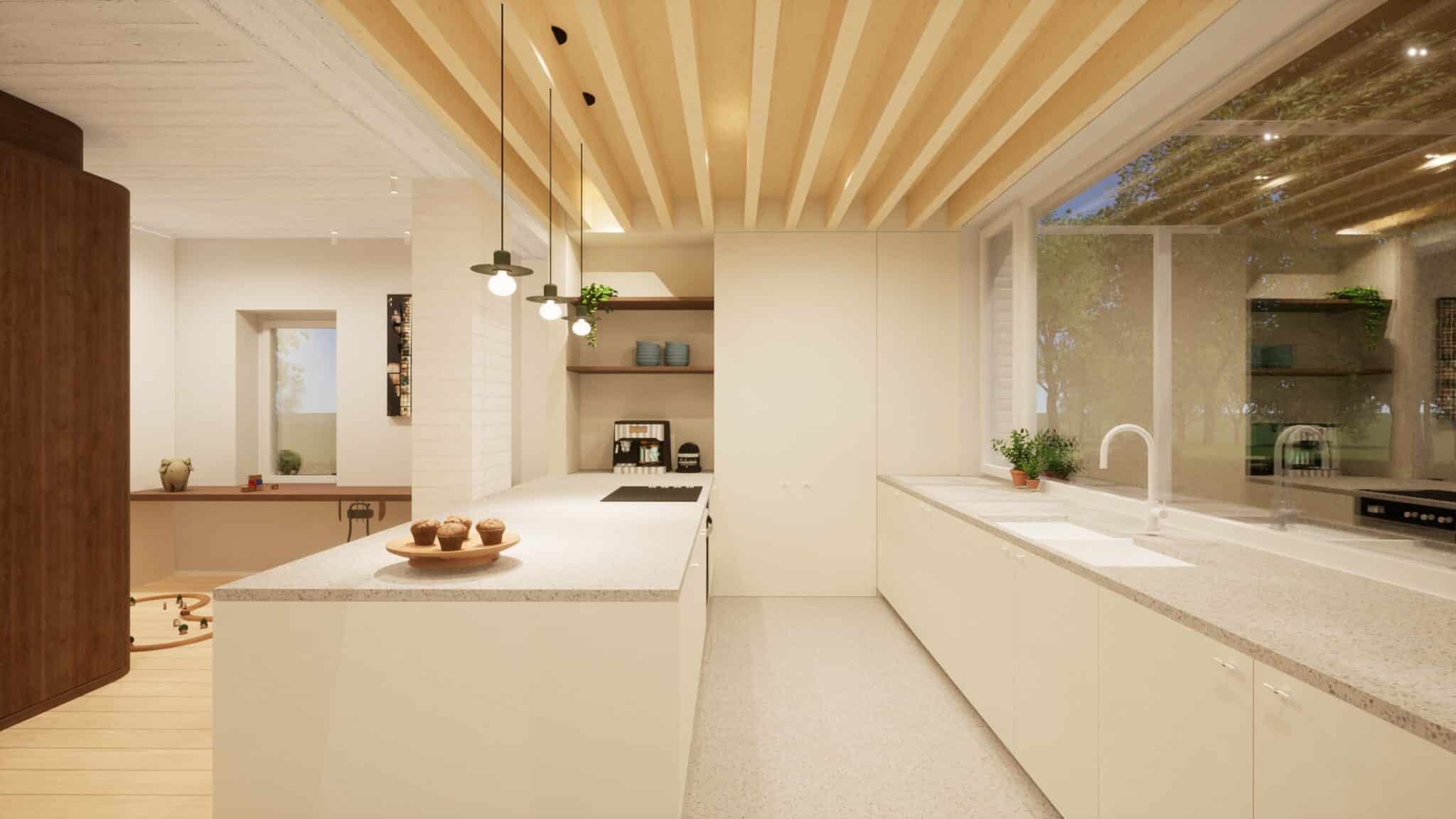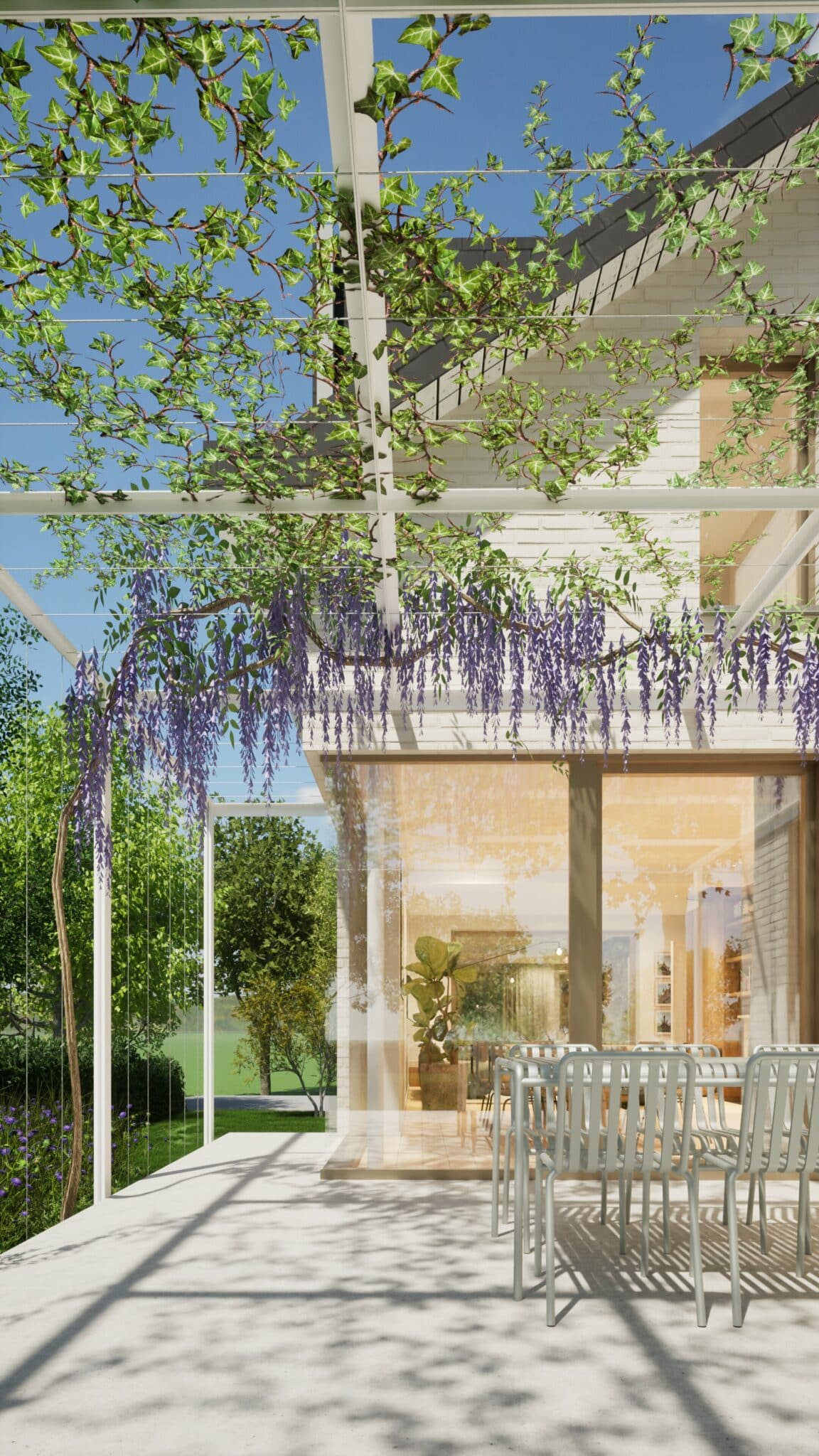 L’amélioration de la performance énergétique constitue un aspect essentiel du projet, notamment grâce à l’isolation des murs par l’extérieur, rendue possible par le démontage et la remise en place des briques de parement. Enfin, une structure métallique légère, destinée à accueillir des plantes grimpantes, viendra créer une terrasse ombragée tout en protégeant les nouvelles baies vitrées de la chaleur estivale.