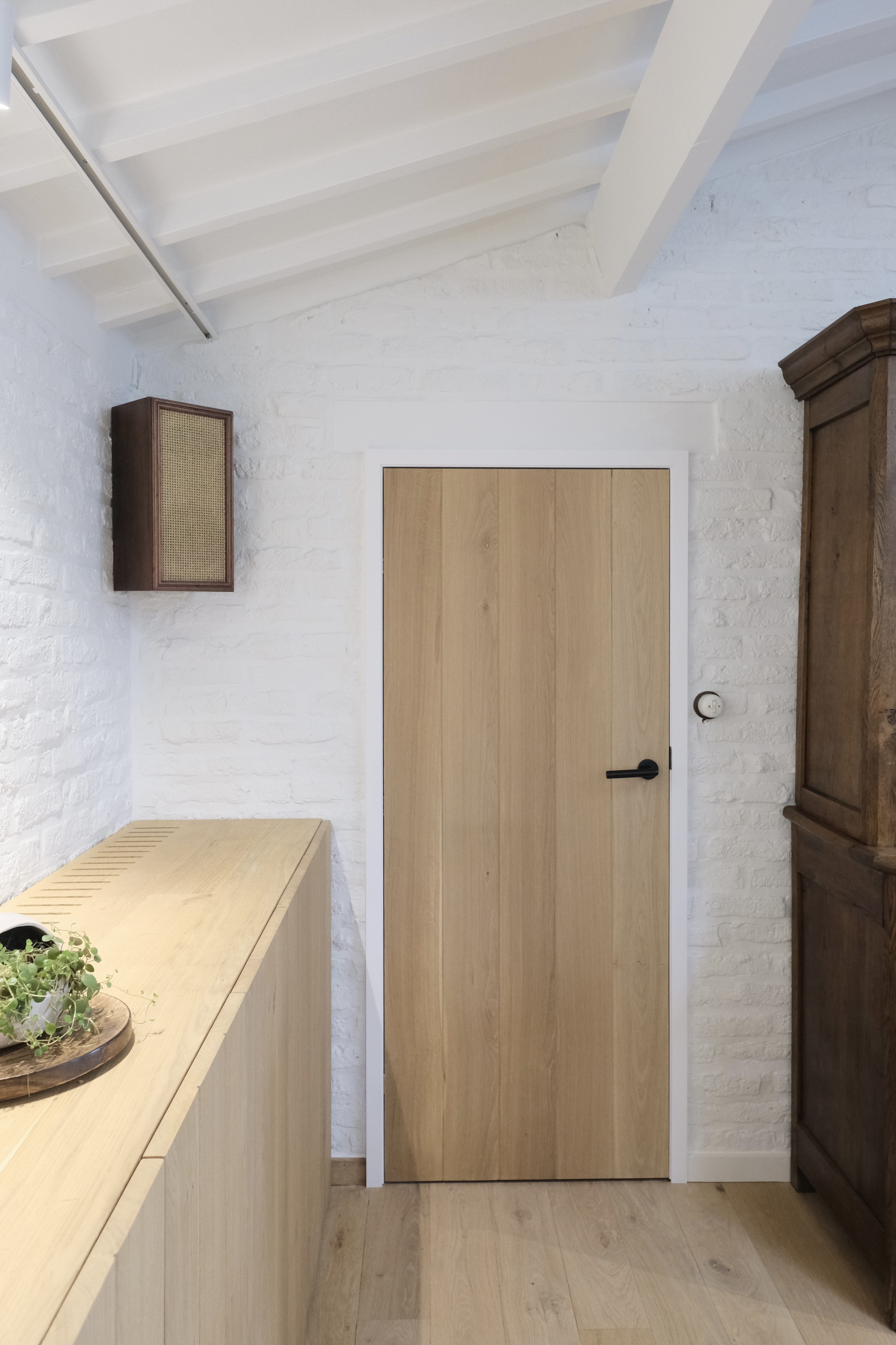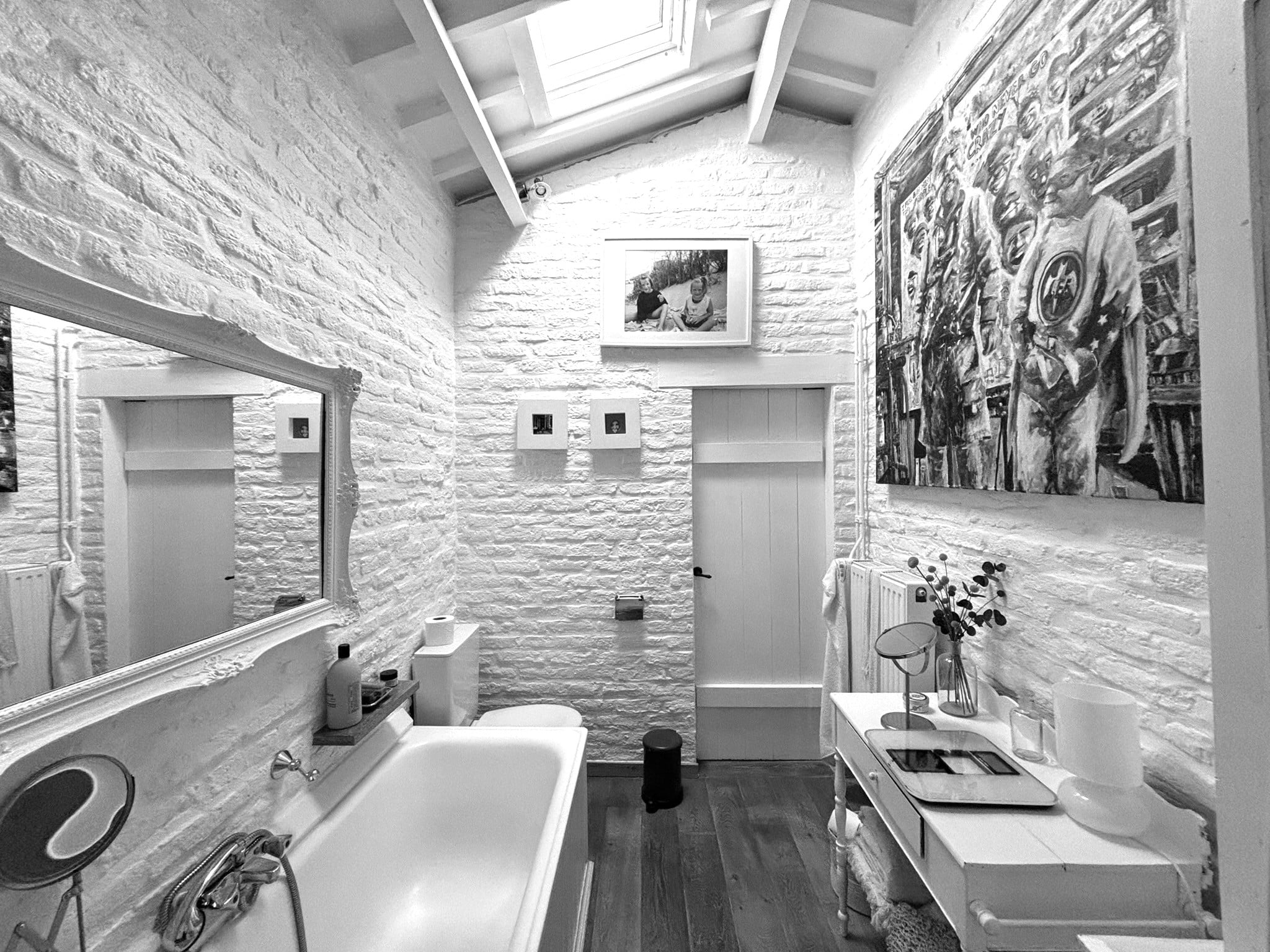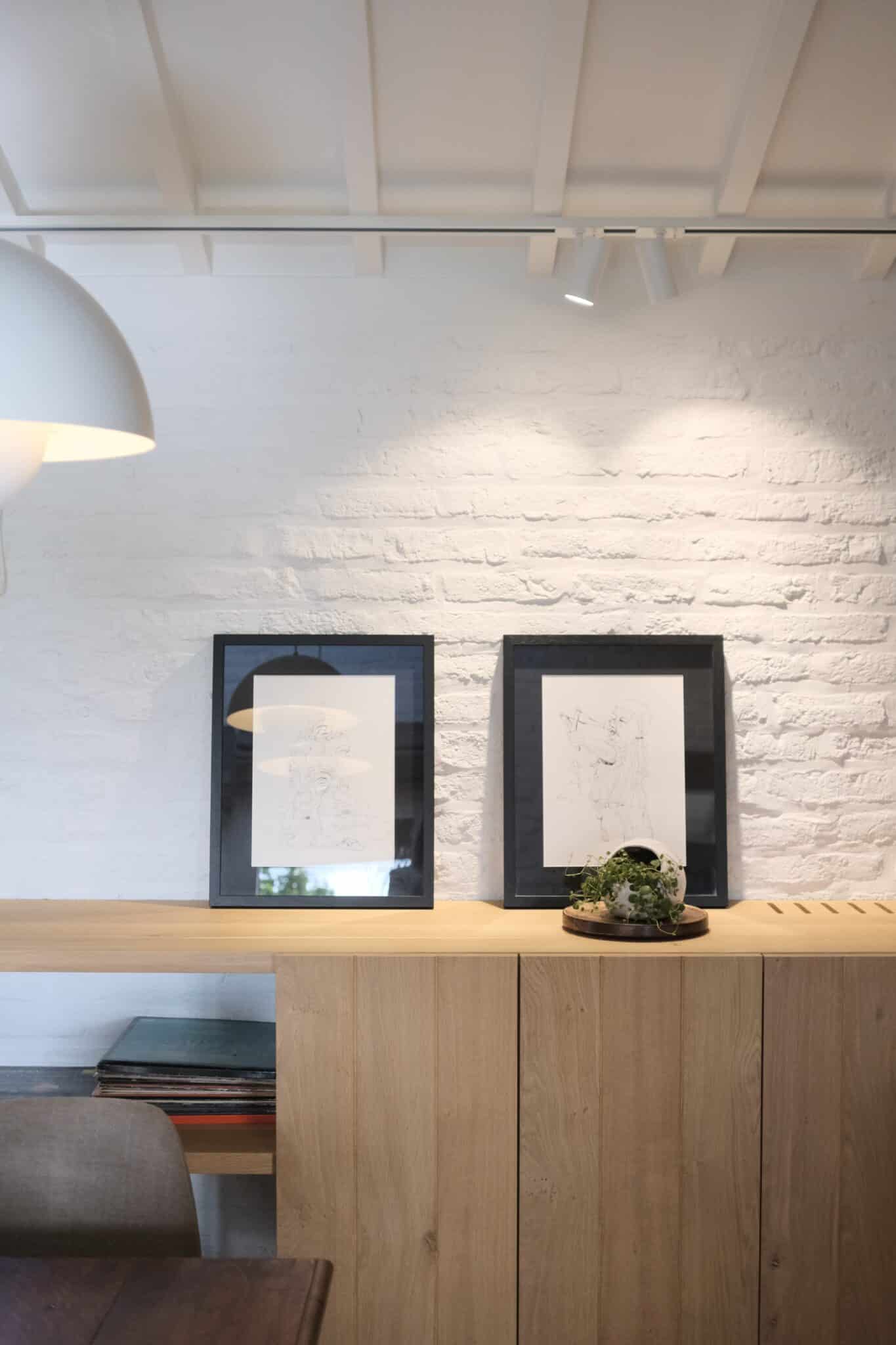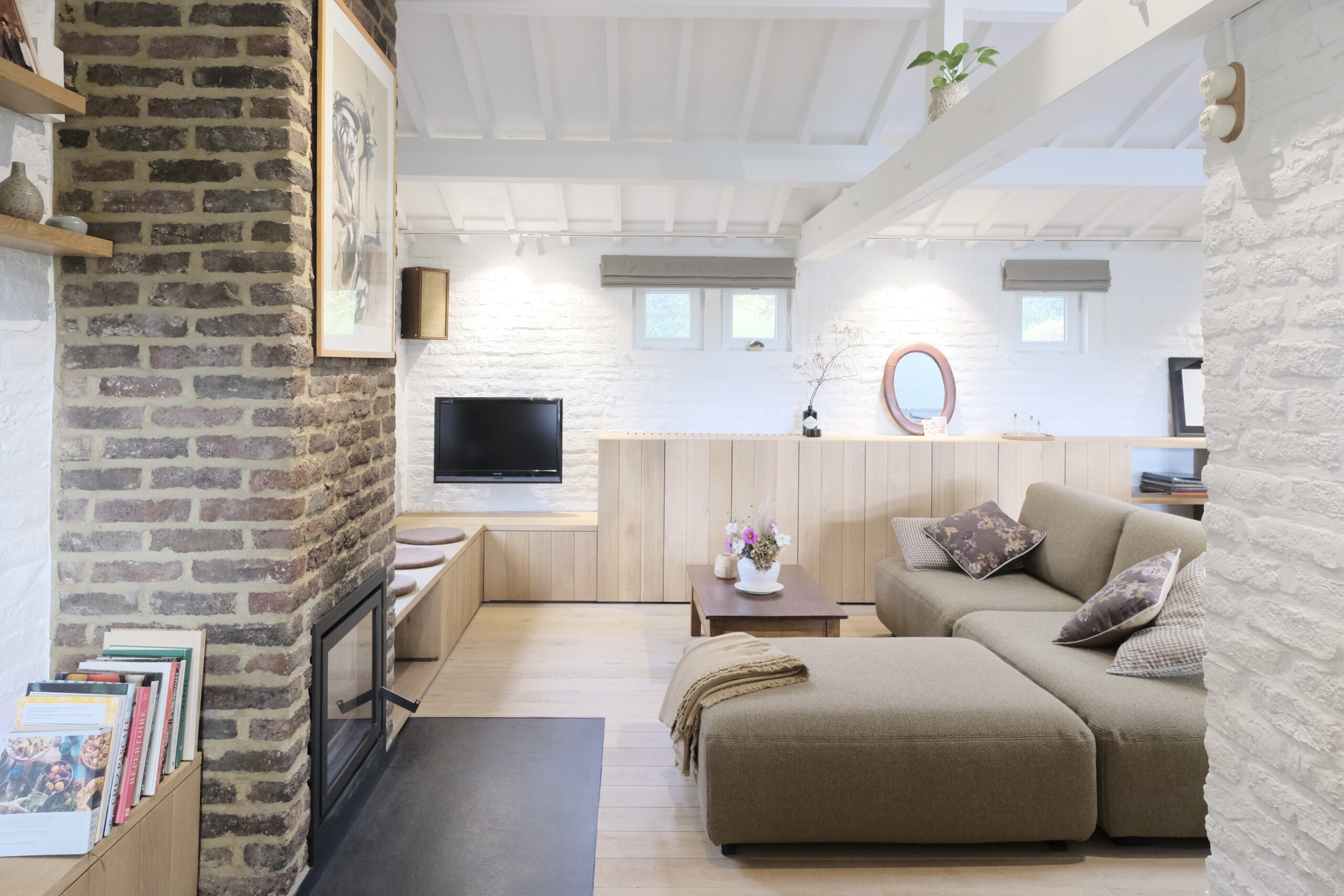 Les briques intérieures apparentes ont été éclaircies par une mise en peinture blanche, tandis que les nouveaux mobiliers du séjour, réalisés en chêne massif clair, font écho au parquet existant et renforcent l’unité de l’ensemble. L’ajout d’une fenêtre de toit vient, quant à lui, baigner les espaces de lumière naturelle.