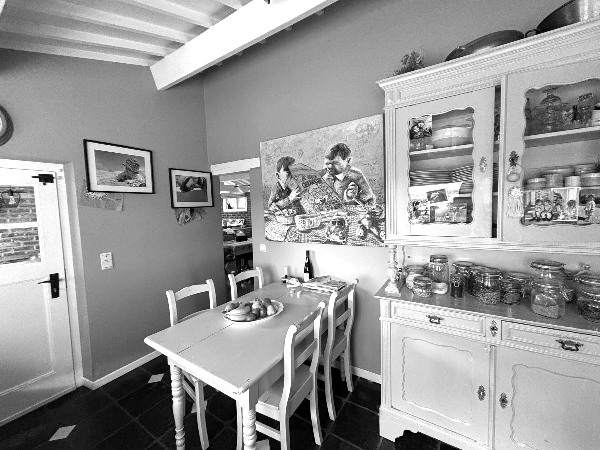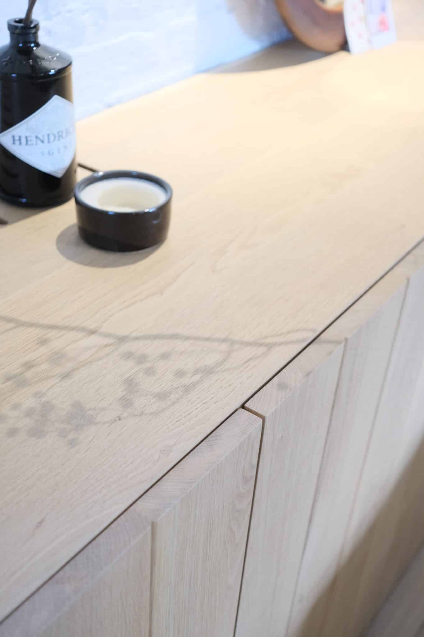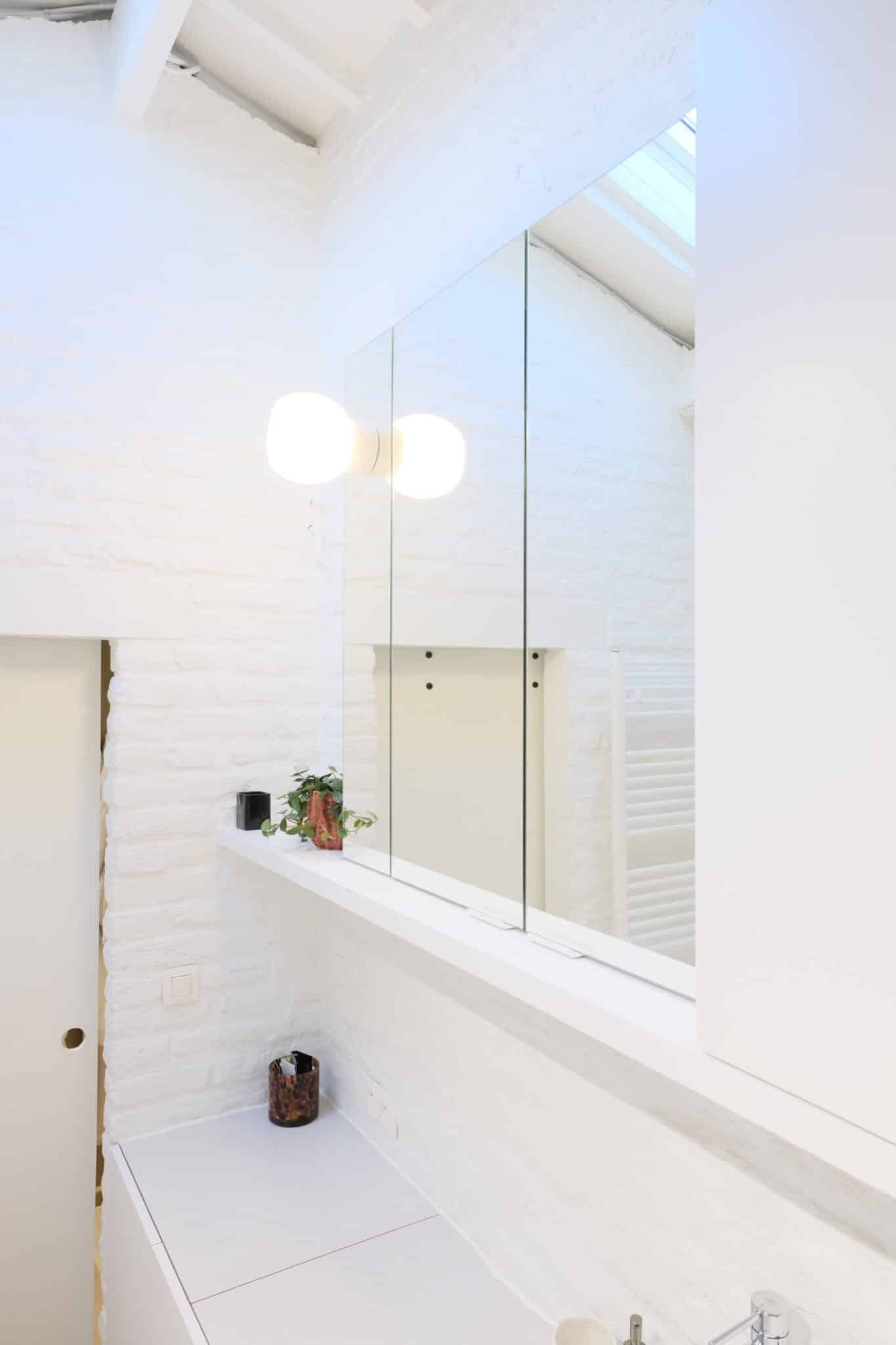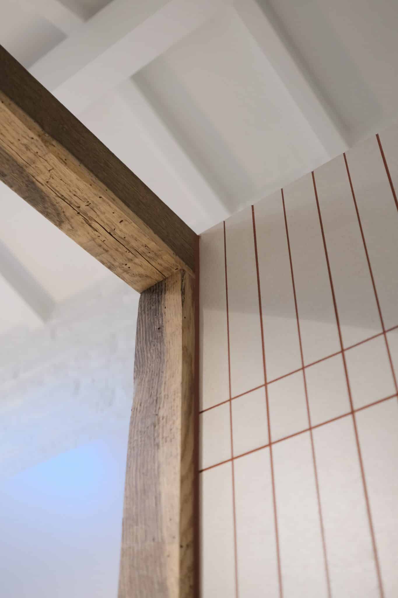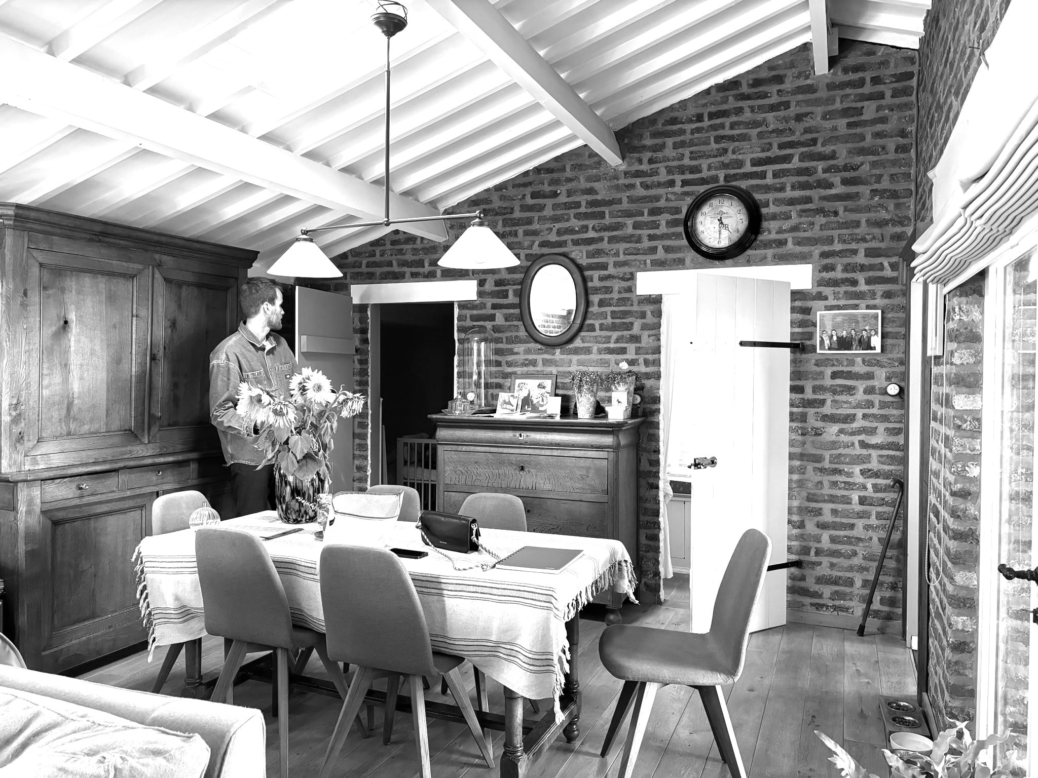 Les briques intérieures apparentes ont été éclaircies par une mise en peinture blanche, tandis que les nouveaux mobiliers du séjour, réalisés en chêne massif clair, font écho au parquet existant et renforcent l’unité de l’ensemble. L’ajout d’une fenêtre de toit vient, quant à lui, baigner les espaces de lumière naturelle.